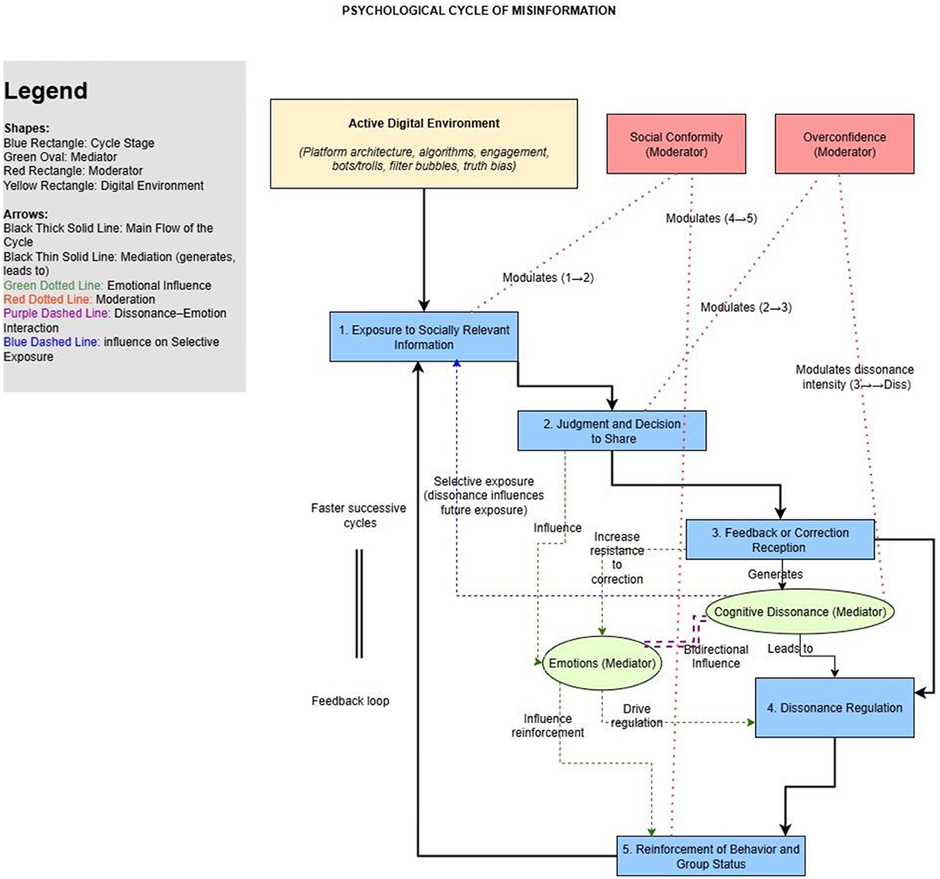 Figure 1. Graphical representation of the psychosocial cycle of misinformation. The cycle comprises five interdependent stages—exposure, judgment and sharing, feedback, dissonance regulation, and reinforcement—sustained by the interaction of overconfidence bias, social conformity, and cognitive dissonance. Emotional factors act as modulators, amplifying or attenuating the dynamics at each stage. This cycle explains the psychosocial legitimation and persistence of misinformation in digital environments. Shapes: blue rectangle: cycle stage; green oval: mediator; red rectangle: moderator; yellow rectangle: digital environment; arrows: black thick solid line: main flow of the cycle; black thin solid line: mediation (generates, leads to); green dotted line: emotional influence; red dotted line: moderation; purple dashed line: dissonance-emotion interaction; blue dashed line: influence on selective exposure.