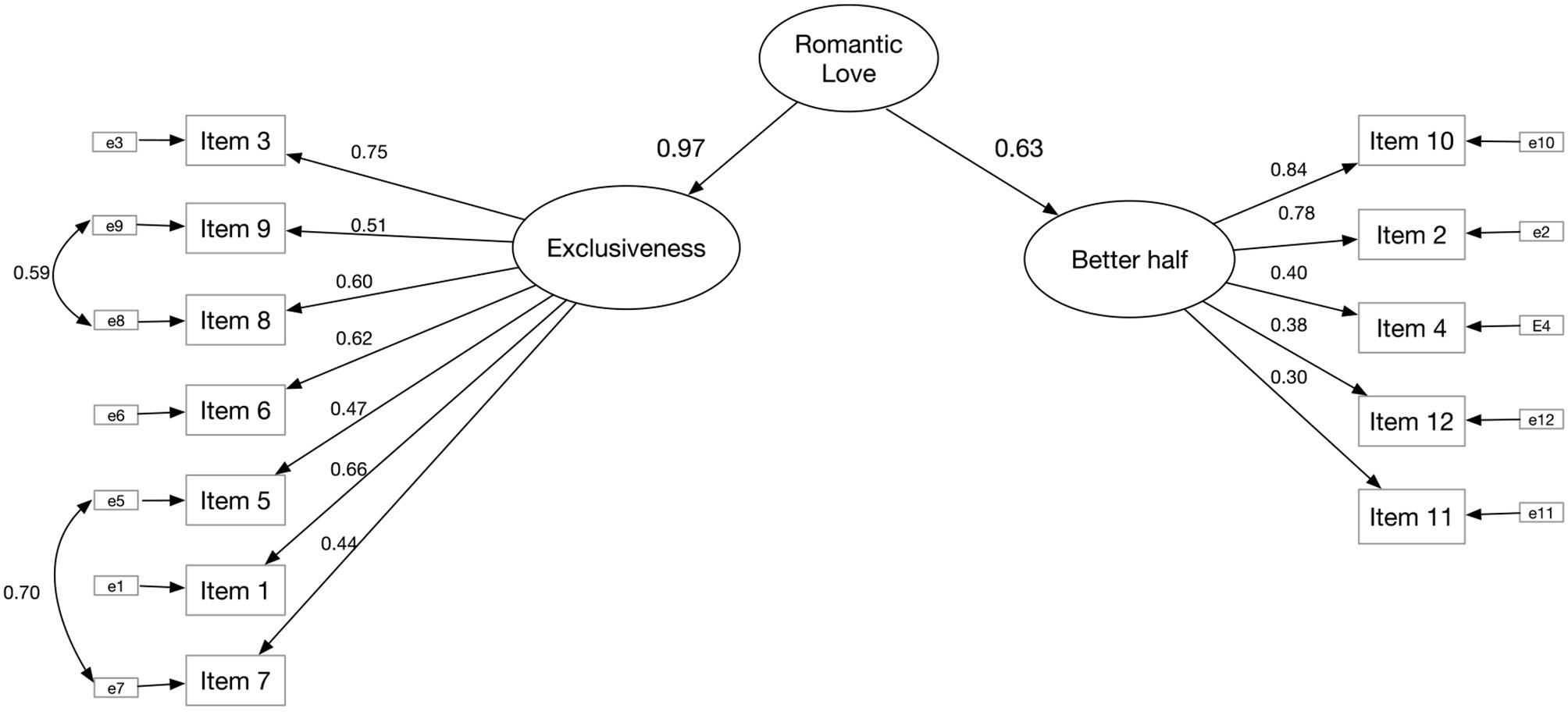 The reliability of the full scale, based on the full sample of participants, gives a Cronbach's alpha of 0.86 (CI [0.85–0.88]), while for the exclusivity factor, the reliability was 0.85 (CI [0.83–0.87]), and for the better half, it was 0.76 (CI [0.72–0.78]).