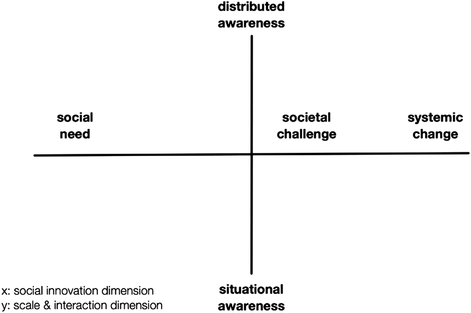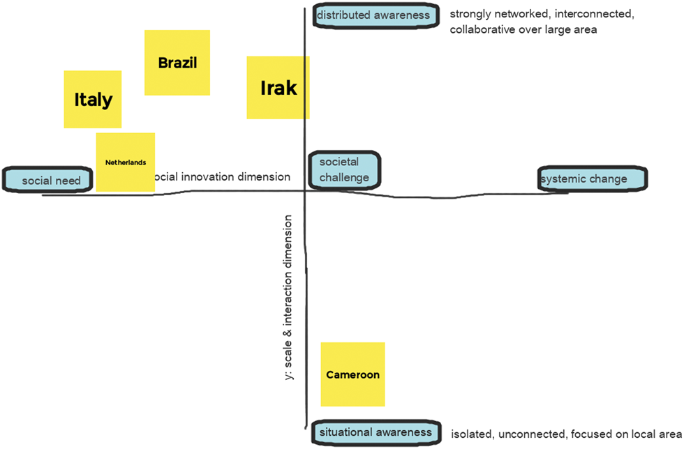 The starting point of the focus group was a short presentation by the researchers of the three dimensions of social innovation also shared on a Google Jamboard-board and presented in Chapter 3 of this article. After this introduction, the case representatives were invited to place their COVID-19 response initiatives on the respective dimension of social innovation (micro—meso—macro) and explain their decision. In the next step, a second dimension was introduced, the scale and interaction dimension, as an indicator for connectedness (Figure 3). This dimension on the vertical axis refers on the one end to a situational awareness, where single actors tend to work relatively isolated, unconnected, and focus on the local area working on very local issues. On the other end of the axis, we speak about distributed awareness, referring to very strongly networked, interconnected makes, who work collaboratively over large areas, or even globally. This matrix of scale and social innovation dimension has been applied in previous studies and has provided valuable insights into the characteristics of maker initiatives (e.g., Unterfrauner et al., 2020).