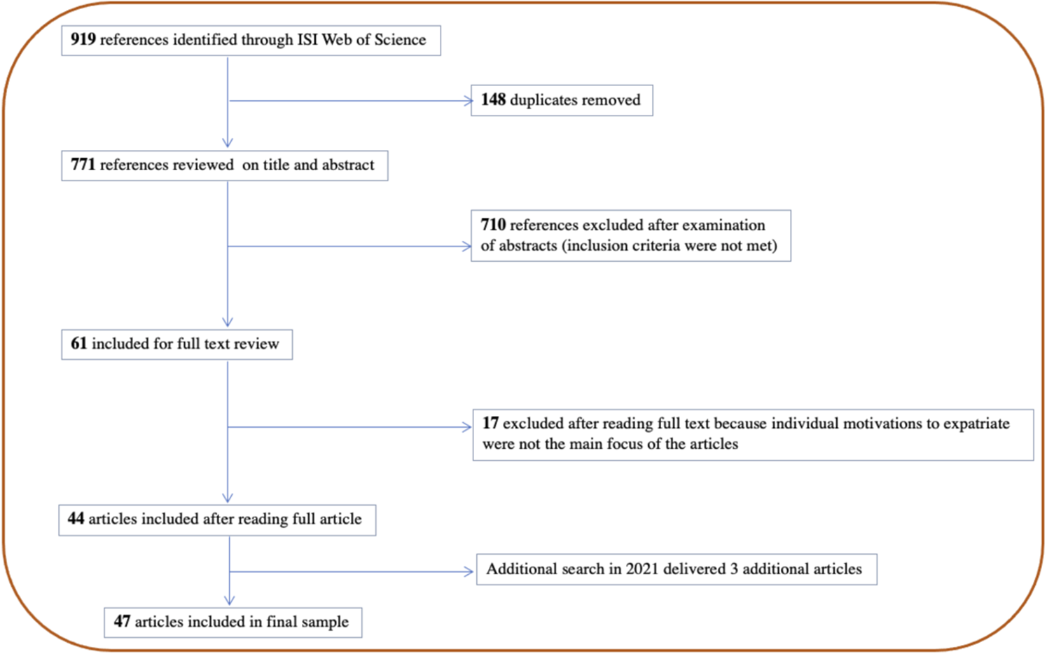 We conducted a series of searches using the ISI Web of Knowledge Database. This database has been used in prior similar work (e.g., Al-Ariss and Crowley-Henry, 2013; Farcas and Goncalves, 2017; Davda et al., 2018) because it includes all journals that have an impact factor and are listed in the Social Science Citation Index; hence, these journals are recognized to have an impact in the expatriation field. We found that the first article examining motivations to expatriate was published in 1994. Our initial search started in 2019 and was therefore focused on identifying articles that were published in the period between 1994 and 2019. We limited the scope of our review by using the key words “expatriate”, “migrant” and “digital nomad” combined with the additional key words “motive”, “motiv”, and “reason” because these terms are mainly used in articles studying motivations in the expatriation literature (e.g., Doherty et al., 2011; Harry et al., 2017). This search returned 919 results. Then, 148 duplicate articles were removed automatically by the web of science, leaving us with 771 articles. We then proceeded to read the abstracts of all 771 articles and excluded another 710 articles because the topics of those articles did not match the purpose of our review. The excluded articles discussed topics such as medical tourism behavior (Mathijsen, 2019), psychological contract perspectives on expatriation failure (Kumarika Perera et al., 2017) and cultural leadership behavior (Kennedy, 2018). All remaining 61 articles were included for full text review, but only 44 articles were included in the final sample because these articles examine individual motivations to expatriate, are empirical studies (i.e., quantitative and qualitative studies) and are written in English. Therefore, literature review articles and empirical studies written in a language other than English were excluded from the final sample. In 2021, we followed the same search strategy to explore whether new articles were published between 2019 and 2021. This search added two articles to the final sample. One additional article was added as it was suggested by a reviewer. The final sample includes 47 articles. Figure 1 shows our data collection visually, and Table 1 includes a bibliography of all included articles.