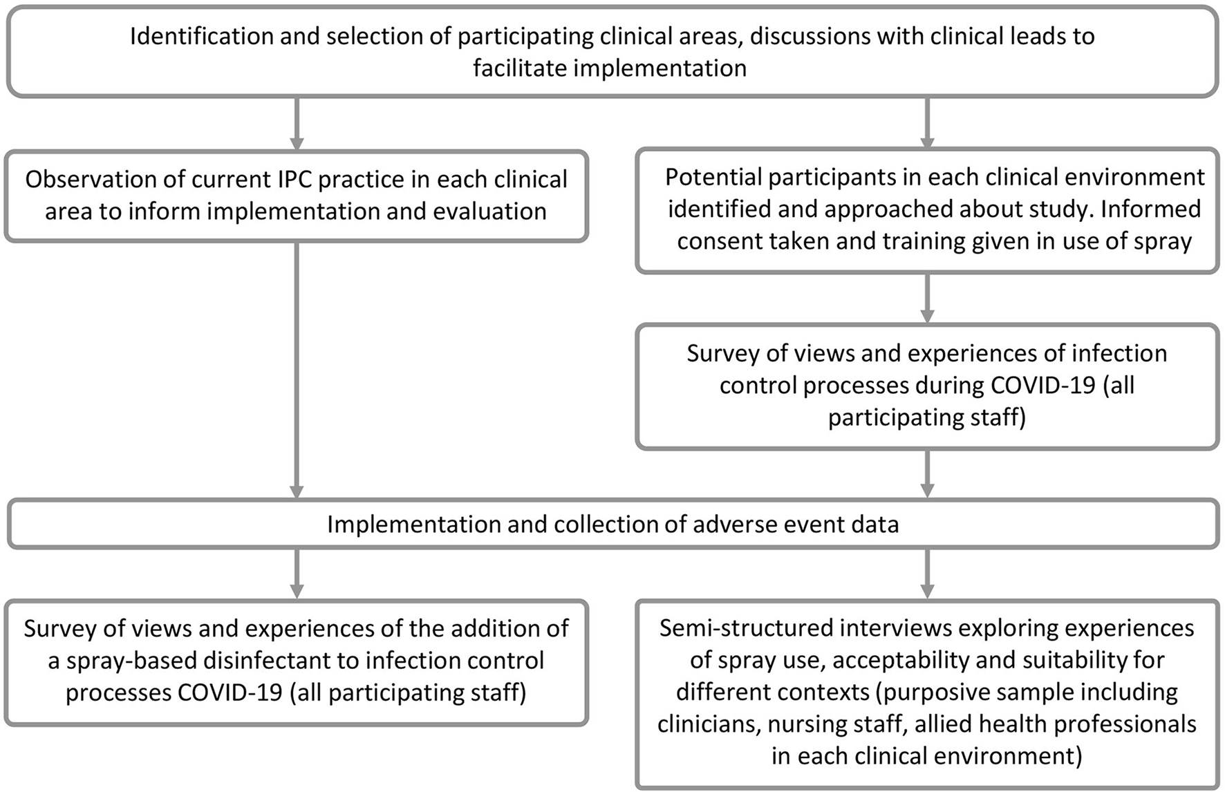 The risks that the research activity posed to IPC within the hospital and the risk of COVID-19 infection to the research team were regularly reviewed at weekly project management meetings. All in-person research activity was conducted by team members who were hospital staff and trained to work in clinical environments during COVID-19 and had received an individual risk assessment. Face-to-face meetings and data collection were kept to the minimum necessary, and social distancing guidelines were followed at all times.
