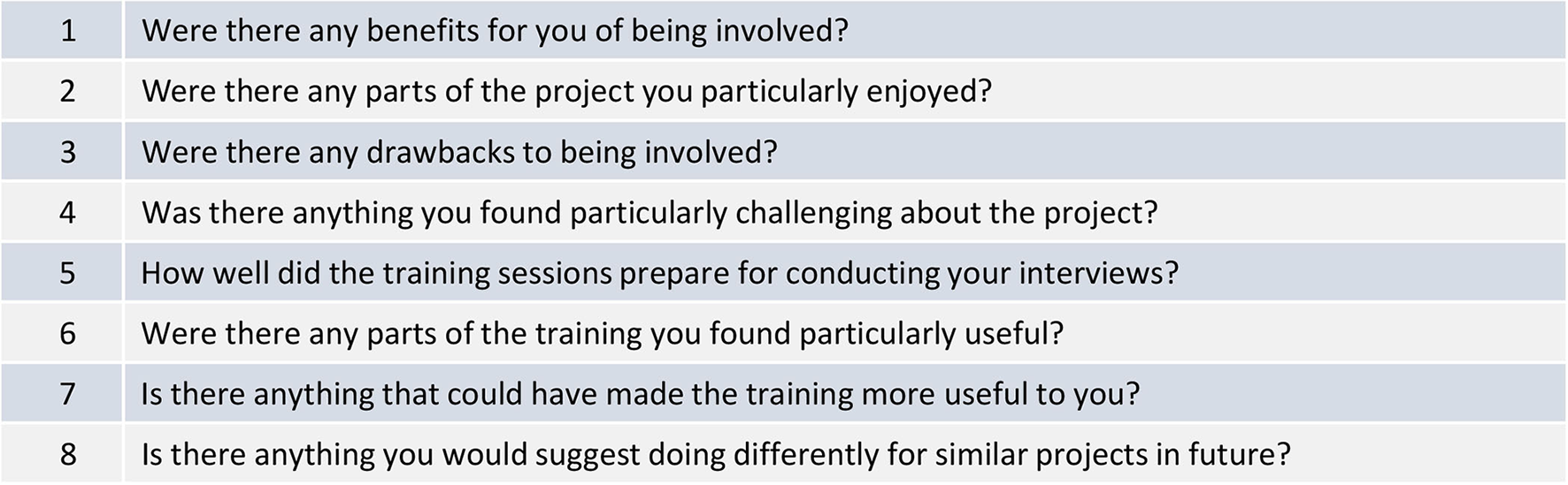 Due to the rapid methods being employed, a team of six researchers conducted the interviews, including experienced qualitative researchers (NR, SP, and RH) and junior doctors/clinical fellows with no prior experience of qualitative research (RS, MK, and JH). Junior doctors/clinical fellows interested in obtaining research experience were approached by study clinical co-applicants and invited to join the study team – clinical fellows came from infection control (RS) and surgical (MK and JH) specialties. There was an equal split in gender with three female (NR, RH, and RS) and three male (SP, MK, and JH) interviewers. The doctors all worked in clinical areas participating in the study and did not interview HCWs from their own teams. They were given two training sessions prior to conducting qualitative interviews; these sessions focussed on interview technique and the practical aspects of conducting interviews. They were also provided with opportunities to view interviews conducted by experienced qualitative interviewers and to practise using the CLEAN topic guide.