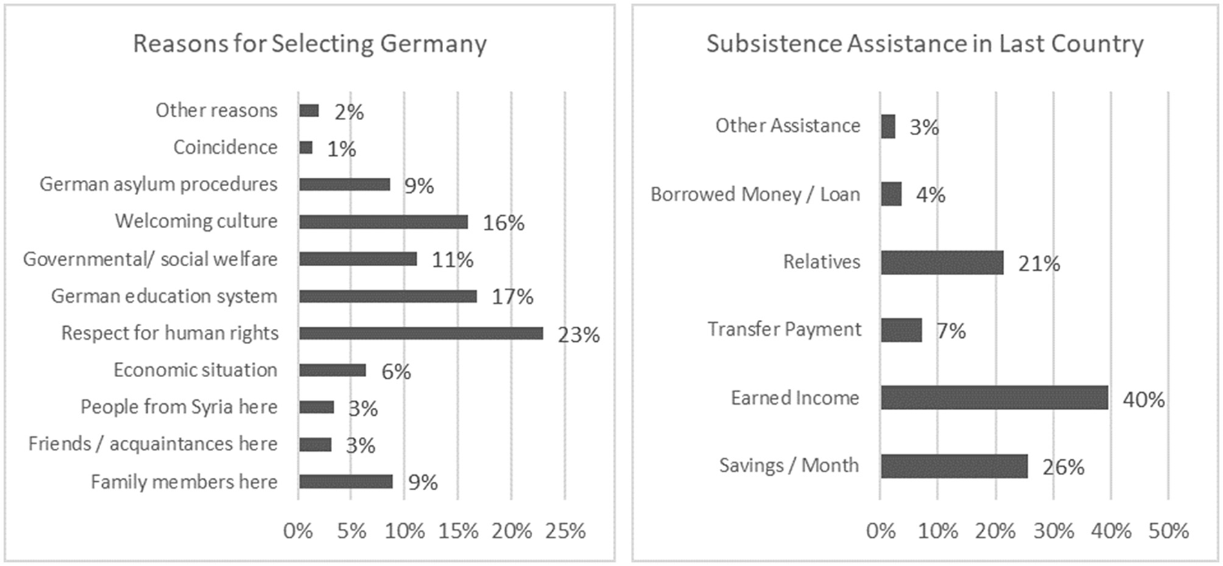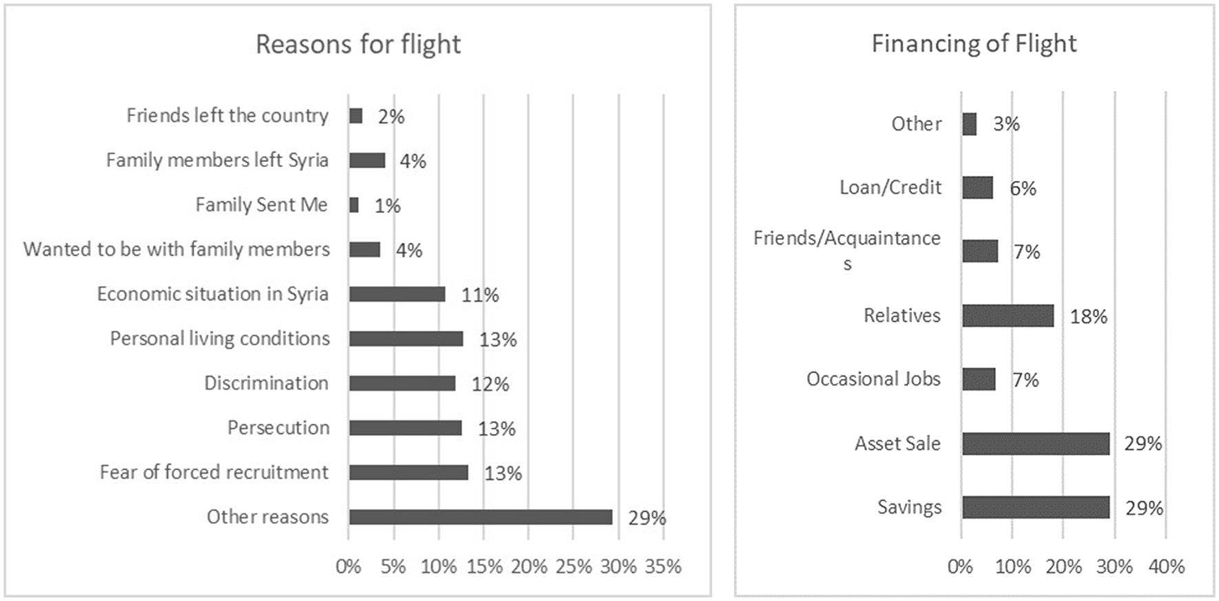 Figure 2 presents the frequencies of answers concerning the reasons for and financing of forced migration. Five main reasons stand out, and these could be classified into two main categories: violence-based reasons and economic reasons. Thirteen percent of responses indicated “fear of forced recruitment” in Syria, followed by persecution (13%) and discrimination (12%). In terms of economic reasons, the economic situation of the country and the respondent's personal living conditions were most frequently mentioned (11 and 13%, respectively).15 Concerning the resources used for financing the flight, the three most frequently mentioned sources were savings (29%), assets sold (29%), and money from relatives (18%).16