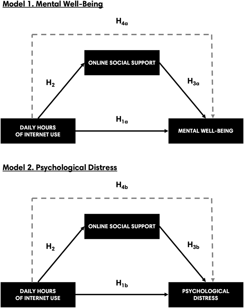 H4a: Daily hours of Internet use has an indirect effect on mental wellbeing through the pathway of online social support.