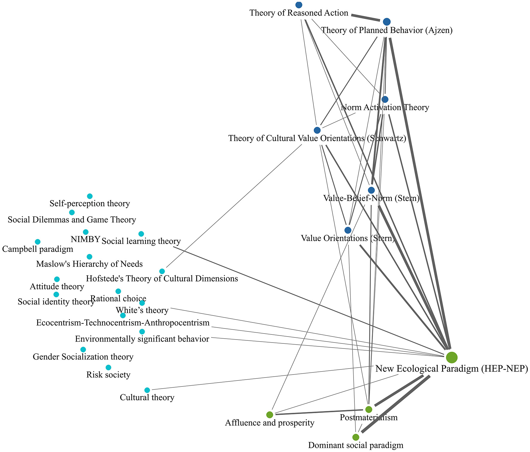 Our detailed analyses trace the occurrence and co-occurrence of theories focusing on environmental behaviors and attitudes, and the empirical data presented supporting the reported theories. We thus go beyond Milfont et al. (2019) bibliometric analysis of EB, which identified a distinct cluster of articles on environmental concern, sustainability, and pro-environmental behaviors, but did not have the room to analyze the dominant theories and their development. Yet, we are also aware of the limitations of our analyses, as we are only able to discuss the trajectory of these theories in very general terms, and cannot offer a detailed history of each theory within this paper.
