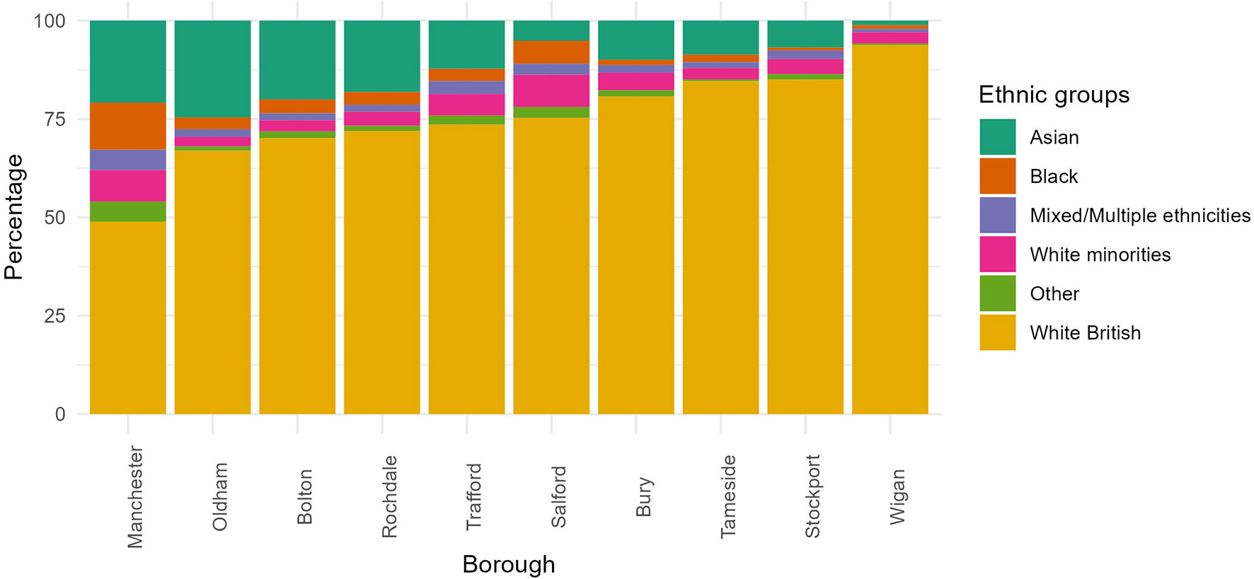 Percentage of population by broad ethnic groups based on the 2021 UK census categories in Greater Manchester boroughs, including the General Population (i.e., White British). The borough with the highest percentage of ethnic minorities is in the extreme left and the borough with the smallest percentage of ethnic minorities is in the extreme right. White British correspond to the General Population composed of White English, Welsh, Scottish, Northern Irish, and British. The Asian group is composed of Bangladeshi, Chinese, Indian, Pakistani, and Other Asian. The Black ethnic group includes African, Caribbean, Other Black. The Mixed or Multiple ethnic groups refer to White and Asian, White and Black African, White and Black Caribbean, Other mixed or multiple ethnicities. White minorities are composed of Gypsy or Irish Traveler, Irish, Roma, Other White. Other ethnic group category involves Arab and any other ethnicity. Source: UK 2021 Census.