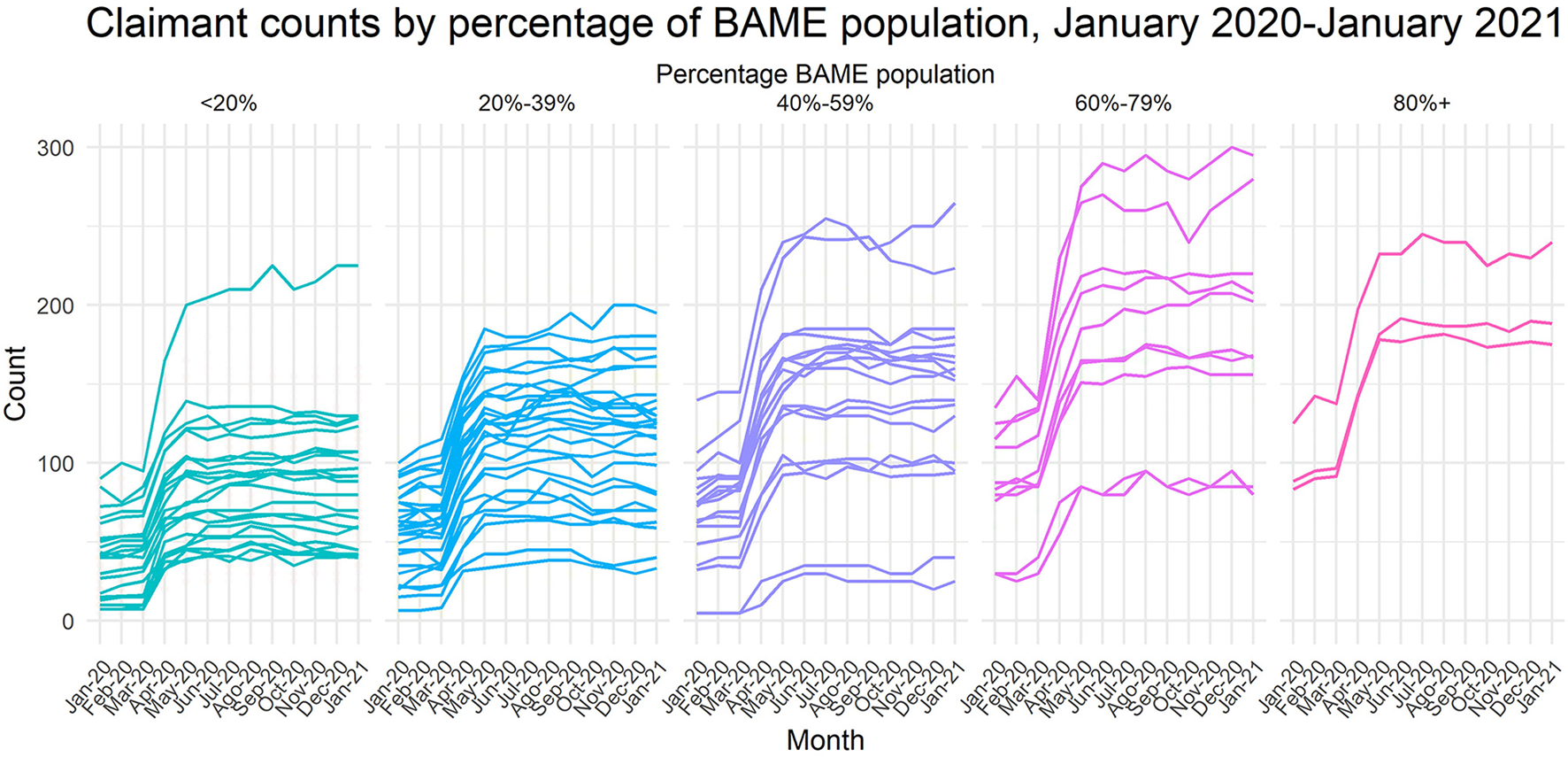 Source: percentage of ethnic minority in the population based on Annual Population Survey and claimant count retrieved from Nomis database.