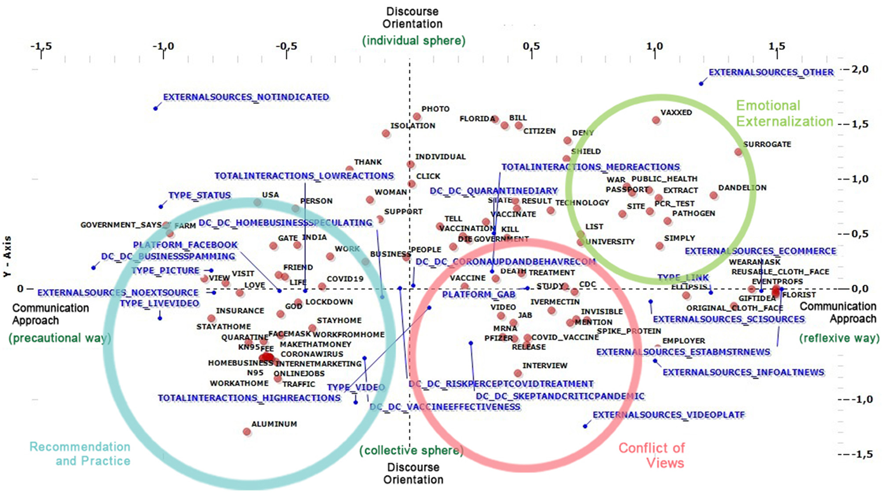 Before discussing the results of the analysis, it is necessary to describe how the LCA (Lexical correspondence Analysis) plan is constructed and how emerged the main latent dimensions thanks to the multidimensional approach we used to process and analyze textual material. The first one, on the horizontal axis, is concerned with the primary communication approach to Covid and vaccine issues. It synthesizes the reactions to the pandemic situation during the first period of the pandemic. Facebook and its related behavioral approaches are to the left of the axis. Here, we emphasized and concentrated on the precautionary ways of self-protection from contagion, such as staying at home and avoiding interactions. Contrariwise, the right of the axis where Gab is positioned focuses on the meditative and wise approaches open to the debate among users and their reactions to the pandemic issue over the longer term. Here, it is possible to detect those posts linked to the discussions on the control measures, COVID victims, and vaccine reliability.