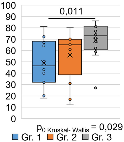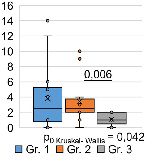 | Gr.1 | Gr.2 | Gr.3 | Gr1 and Gr2 | Gr1 and Gr3 | Gr2 and Gr3 | H | p 0 | |