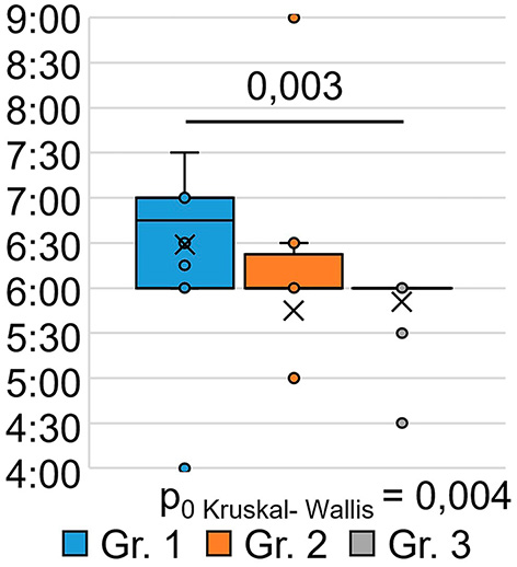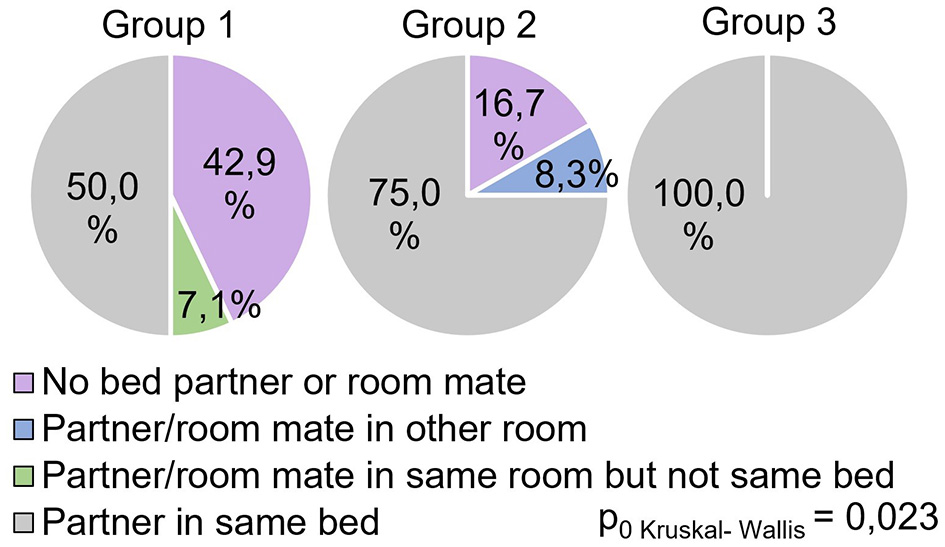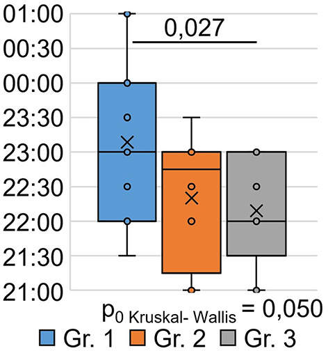 The indicator “bedtime” (Figure 3) significantly differed between the groups (H = 6.00 p = 0.050): patients who were treated for SARS-CoV-2 infection in an oxygen-supported hospital (group 1) went to bed at a later time after 9 months (p = 0.027) than the respondents in Group 3 who were treated for SARS-CoV-2 infection on an outpatient basis.