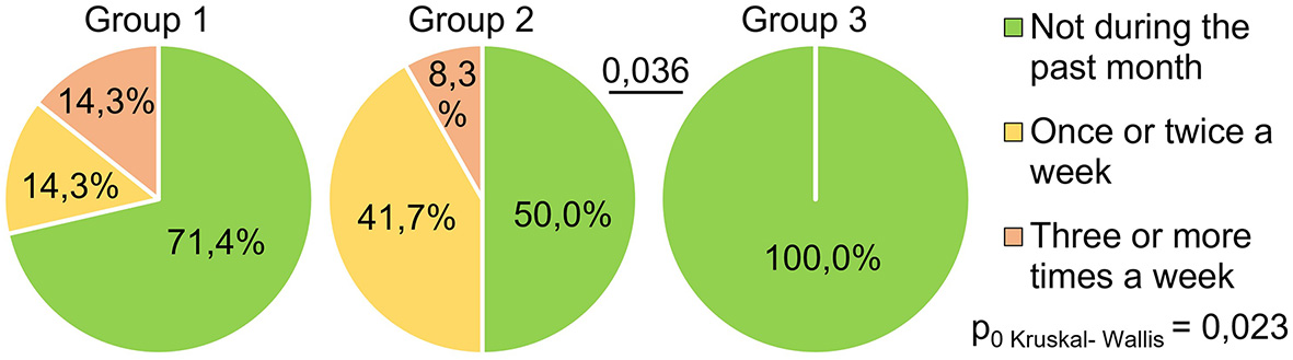 | Anxiety / Depression | I don't experience anxiety or depression | 71.4% | 91.7% | 100.0% | Gr1 and Gr2–0,368 Gr1 and Gr3–0,216 Gr2 and Gr3–0,744 | H = 5,26 p = 0,072 |