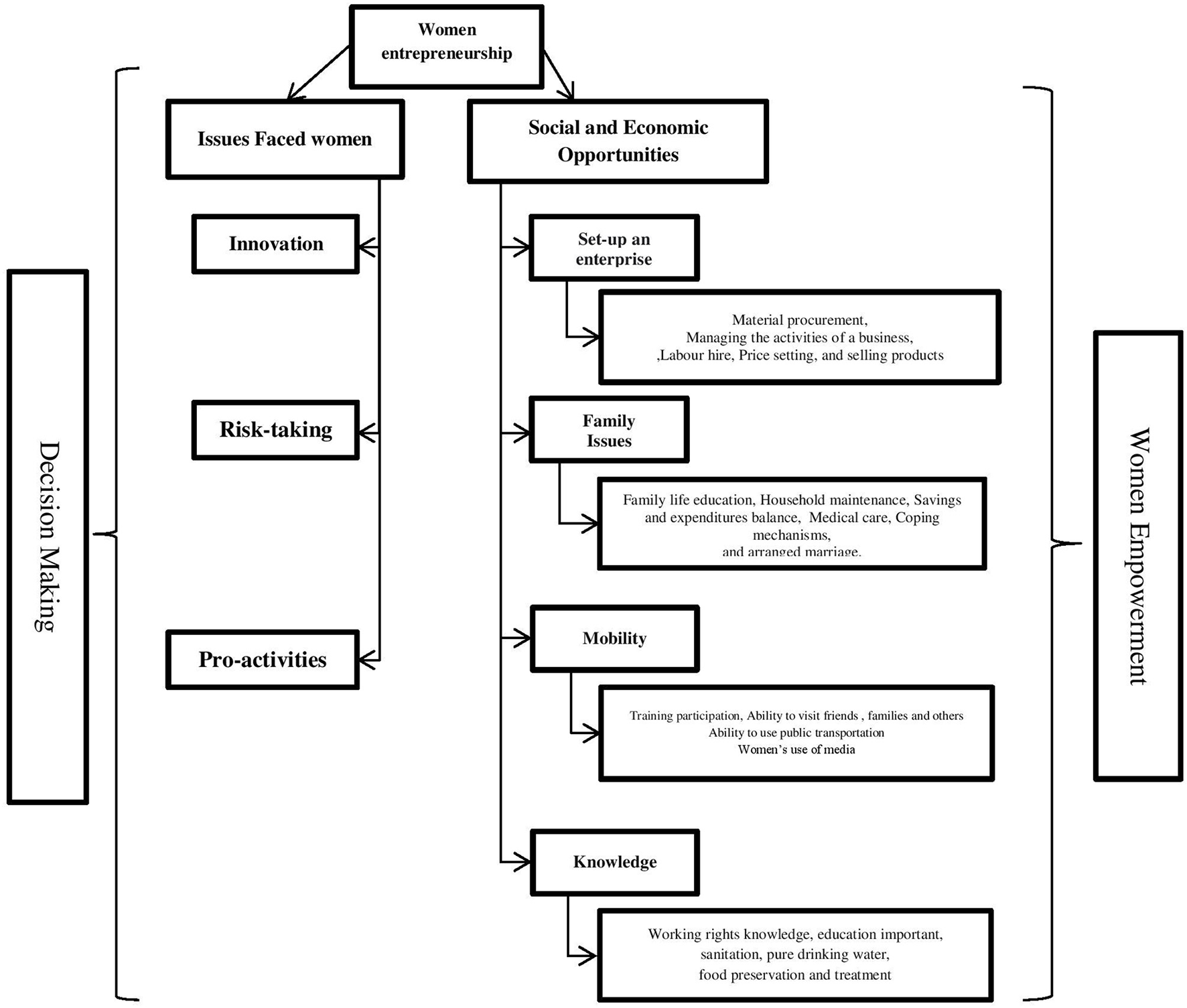 The process of linking entrepreneurship, empowerment, and decision-making is not easy because the concept of entrepreneurship has many dimensions and is difficult to measure. Increasing profits and the concept of empowerment must be linked to the development of entrepreneurship, as more achievements at the level of entrepreneurship will generate more profits and thus be reflected in empowerment and the decision-making process. As the empowerment tool is the main key to the success of setting up any enterprise, it is weighted by material procurement, managing the activities of a business, labor hire, price setting, and selling products. For family issues, family life education, household maintenance, savings and expenditures balance, medical care, coping mechanisms, arranged marriage, etc. are all considered. Training participation, ability to visit friends, families, and others, ability to use public transportation, and women's use of media, etc. are measured for mobility. Knowledge is weighted by working rights knowledge; education is important, as are sanitation, pure drinking water, food preservation, and treatment.