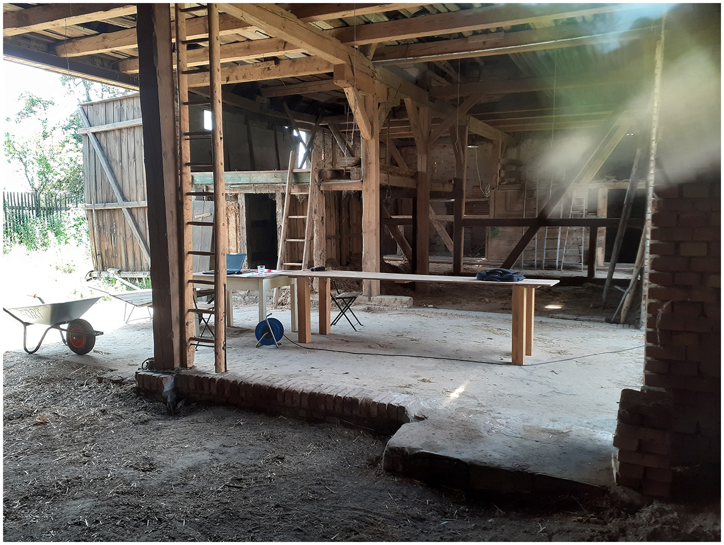Inclusive in terms of gender, disability, age, culture, tradition, religion, or language, these transformative community projects reflect a philosophy of belonging and social connectedness, such as that developed by O'Donohue (1997, 1998). The appreciation of the inner richness that each human being brings with him/her seems a helpful reference at present. Inclusive in these projects would be elders. As a result, expensive elder care facilities could be downsized, and the shortage of skilled workers counteracted. Children living and learning in these projects could relieve preschool facilities and schools, which increasingly suffer staff shortages. Increased contact among generations could foster mutual learning, as was once the case in a natural way. Of course, in the past, there were often power structures, dependencies, peer pressure, or a lack of acceptance of individuality. Taking care not to revert to prior times, yet preserving the best ideas and experiences, we would combine them with a new transformative philosophy. The humane values are always decisive, the orientation toward the good, as we can learn from communitarianism or the philosophy of O'Donohue (1998). Along with these social considerations, the farm project in Anhalt is about very practical things (Broecher, 2023a,b). Learning opportunities include repairing, rebuilding, and modernizing historic buildings, farmhouses, stables and barns, and partly timber-framed buildings. These activities preserve the area's cultural heritage and start to implement ecologically valuable building materials and smart technologies (Figures 1, 2). Other learning areas under exploration are organic farming, fruit growing, and sheep farming.