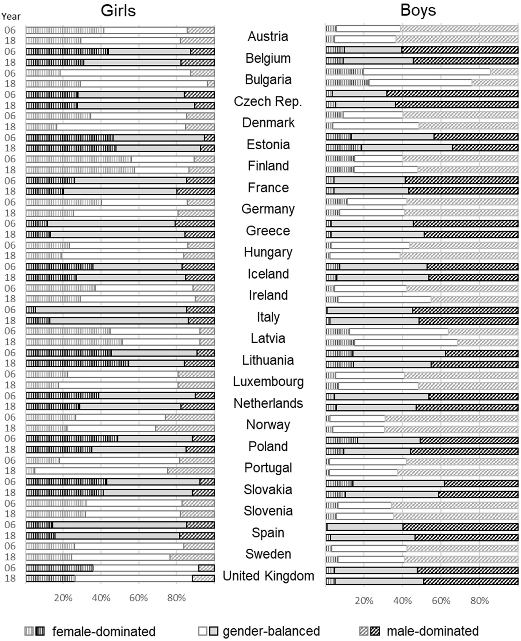The total 2006 PISA sample includes over 398,750 students from 57 countries; the 2018 data includes 617,259 students from 79 countries. Given the high variance of gender segregation between developed and developing countries, we chose to focus only on developed countries. Further, we focus on European countries to ensure that, to a certain degree, these states share common political norms and goals. In addition, we excluded countries for which information on any of the independent variables at the individual or state level was not available. For the individual data of PISA, we included only cases that had valid values for all variables of interest presented in both survey years. This truncation left us with 125,485 cases for 2006 and 139,075 cases for 2018 on the first level and 52 country cases (26 countries for each time point) in the European region on the second level.10