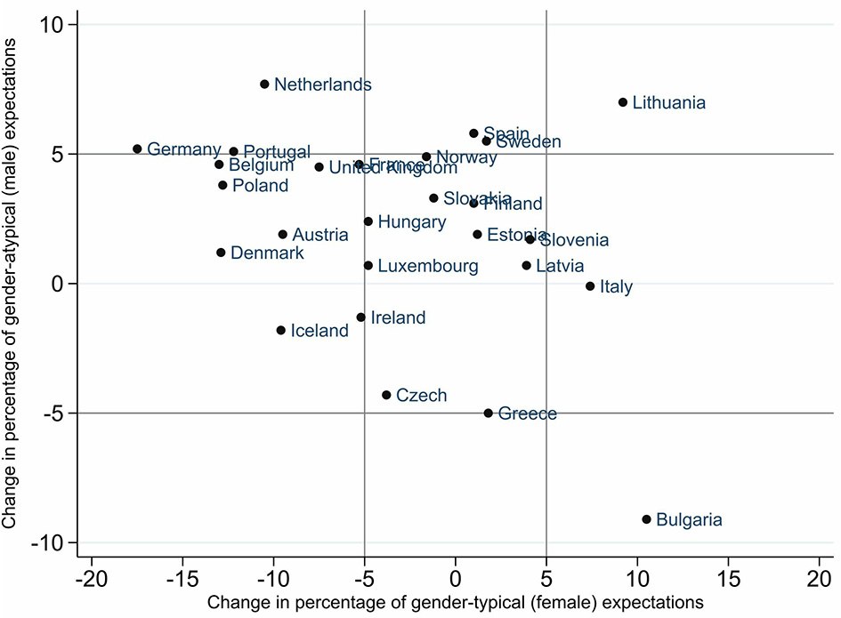 To answer the question of how gendered occupational expectations changed over time, Figures 2, 3 show the change in the percentage of gender-typical and gender-atypical occupational expectations of girls and boys from 2006 to 2018. With the help of these illustrations, the different countries can be divided according to whether occupational expectations have moved more toward gender-typical or gender-atypical expectations or whether they tend to converge in a gender-balanced way. In both figures, the cut-off at 5 percentage points is marked with gray lines, meaning the whole area is divided into nine sections. As a result, very different types of changes emerge.