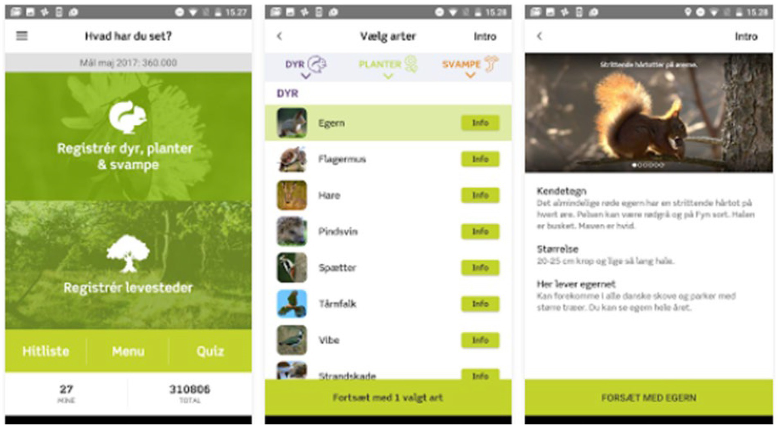 Three screens from the Danish “NatureCheck” app.