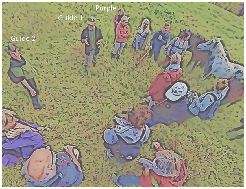 The app was part of a citizen science project run by Copenhagen University in cooperation with DSNC. By the time a guide introduced the app to the nature hike participants the group had acquainted with the swamp area they started the hike from, they had inspected some of the plants in that area and walked a bit further to the site where they were met by a pack of six horses. In the following, I examine the ethnomethodological just thisness that led to the introduction of the app to the group, how the group members react to that introduction, and what kinds of entanglements or assemblages may be discovered. In Figure 4 I have also marked who the guides are and a group member (Purple) who took up the topic in the first place (the hike was documented by a traditional 2D-camera, three chest-mounted GoPros, and two 360-degree cameras on poles out of which one made it possible to get a close-up near the ground (see the participant-researcher in blue) and the other from above the group, from which the shot in Figure 4 comes from).