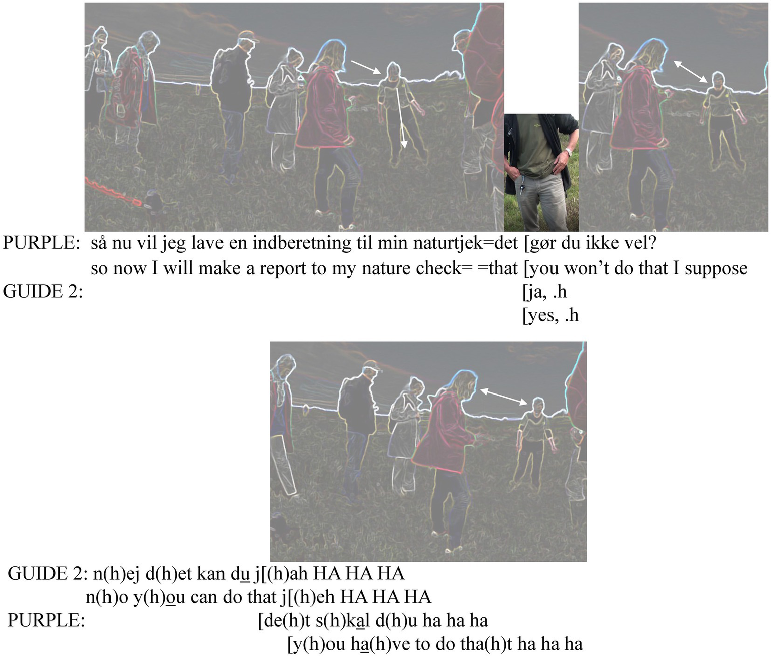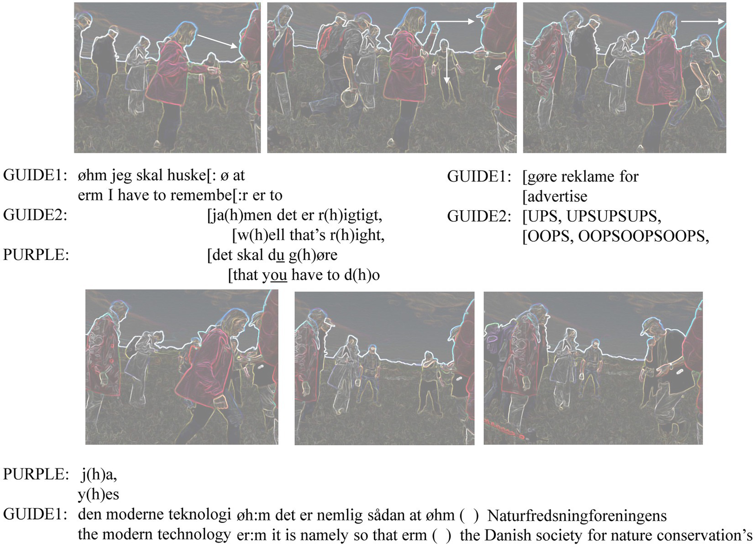 The transcription of how the introduction was set to proceed is a type of cartoon transcript (Laurier, 2014) with a Jeffersonian transcription of both the original Danish and the English translation. The stills show what is going on during the transcribed talk under them. We start with the group gathering to stop around the two guides. Purple has just arrived at the spot and reports having seen an interesting plant earlier (see Figure 5). Purple (P), Guide 2 (G2) and Guide 1 (G1) are marked again in the first pseudonymized frame. The white arrows depict the (sometimes mutual) gaze directions.