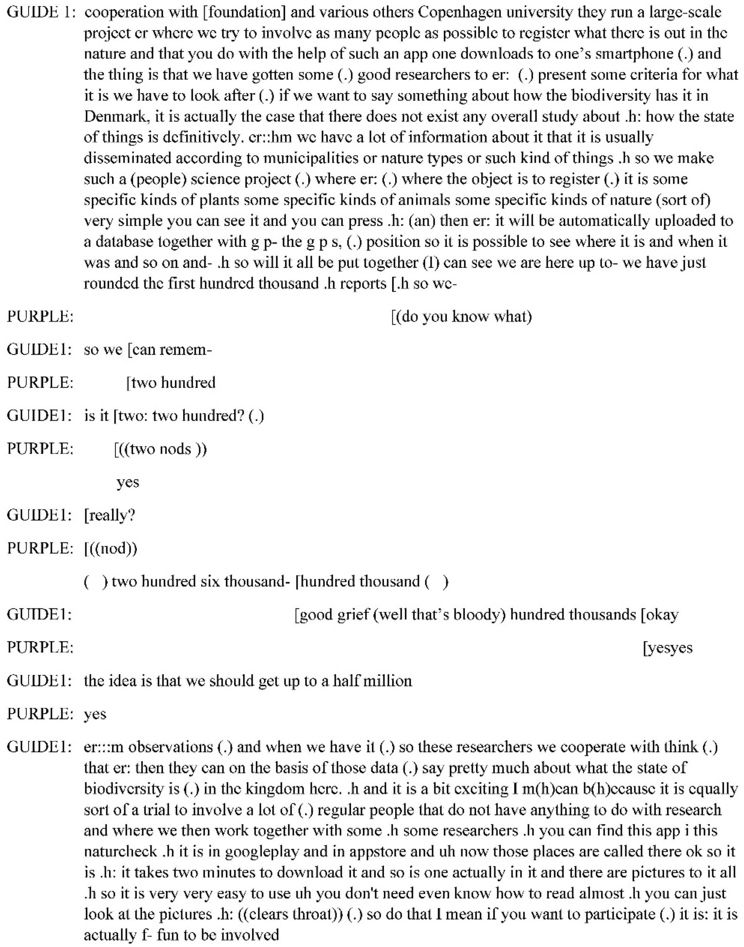 Guide 1 starts his introductory talk to the app by verbalizing the obliged nature (“I have to remember”) of the “advertising.” This incarnation of a previous plan or agreement is different from how he would start talking about the features of the immediate setting, that is, reoriented to a specific feature of it (cf.De Stefani and Mondada, 2014). In overlap with Guide 1’s lengthened “remember” Guide 2, still laughing while talking and gazing down at the plants in front of her, acknowledges Purple’s demand for her to use the app. By then Purple has already turned to Guide 1 who has the phone in his hand. Purple now addresses him with the same tone and with a stress on “you.” In other words, Purple now turns to him as a nature protection hike guide with the membership obligation to register biodiversity. This is at a large assemblic scale, whereas Guide 2 is doing a very local type of nature protection: She stops people from stepping on the rare plants in front of her (“OOPS, OOPSOOPSOOPS”).