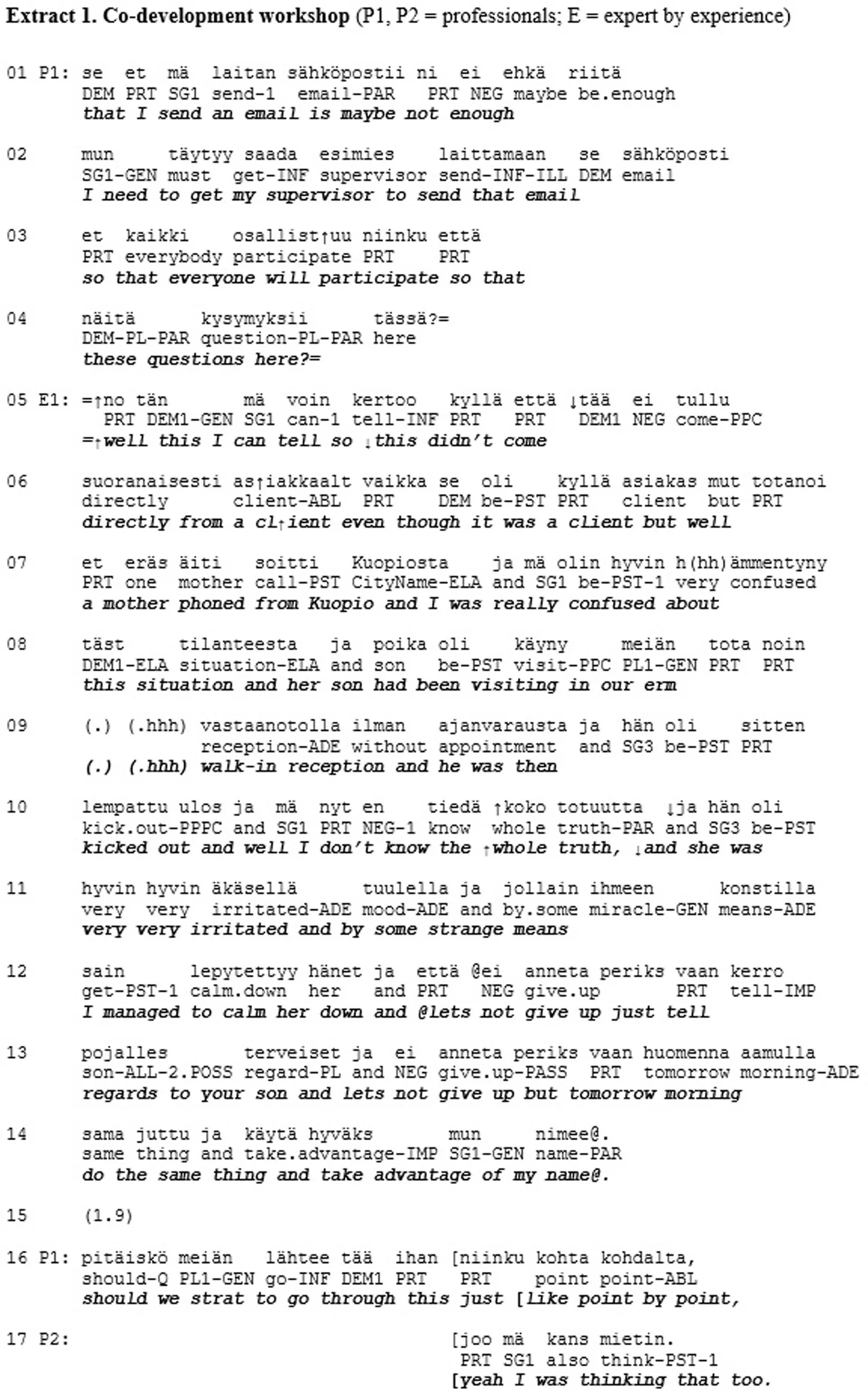 Extract 1 shows an example of misrecognition in the sense of respect. The case is drawn from a co-development workshop, in which professionals in a large social and healthcare organization and the so-called experts-by-experience discuss ways in which the delivery of the social and health care services could be improved (see Weiste et al., 2022). In this case, the participants have previously discussed how to collect feedback from the clients. Just previously, one of the professionals has proposed that the feedback be collected via email, which is also referred to by her colleague (P1) at the beginning of the extract (l. 1–4). At this point, one of the experts-by-experience (E1) takes a turn in the discussion, telling a story about the way in which she has previously helped a mother who had felt that his son had been unjustifiably excluded from the services.