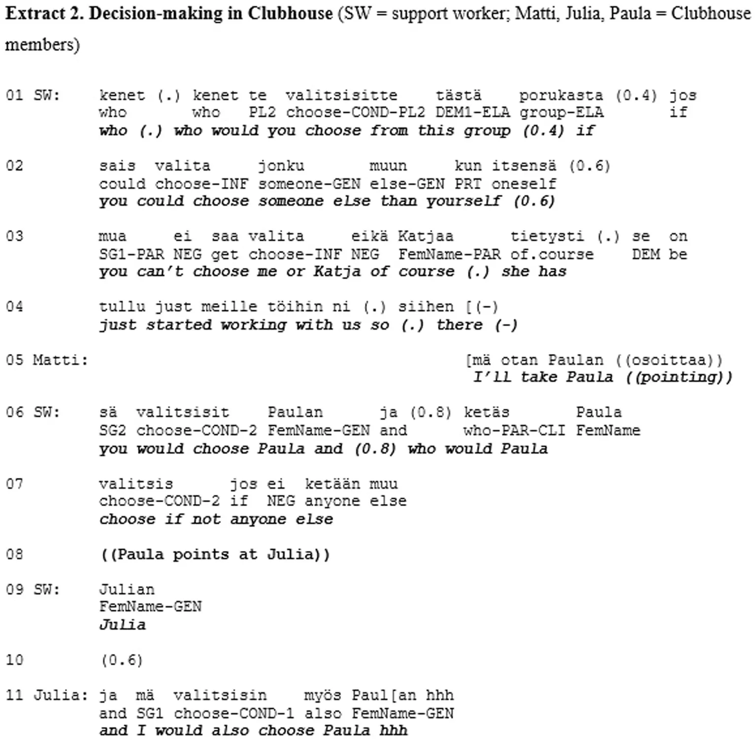 Let us consider another example of how respect—as the fundamental category of recognition—can be at stake in social interaction. Extract 2 is drawn from a study by Valkeapää et al. (2019) and represents a situation that is explicitly framed as being about joint decision making. The decision making takes place within a Clubhouse community—a non-profit organization providing mental health rehabilitation based on membership in the community (Raeburn et al., 2013). The Clubhouse members who wish to enter the labor market are supported by the Clubhouse-created transition employment programme, which involves part-time short-term employment at various cooperating companies. The selection of the individuals getting the chance to try transitional employment is managed by the Clubhouse community, not by the employers. Once succeeded in transitional employment the Clubhouse members have better prospects to seek competitive employment (Henry et al., 2001). The decisions about entrance into transitional employment are thus highly consequential to the Clubhouse members, which is why it is explicitly stated that these decisions should be made democratically in the community (Valkeapää et al., 2019). Extract 2 is from such a decision-making situation.
