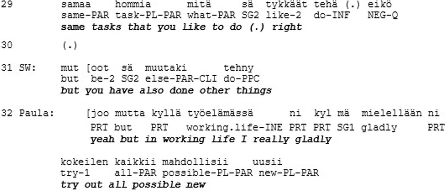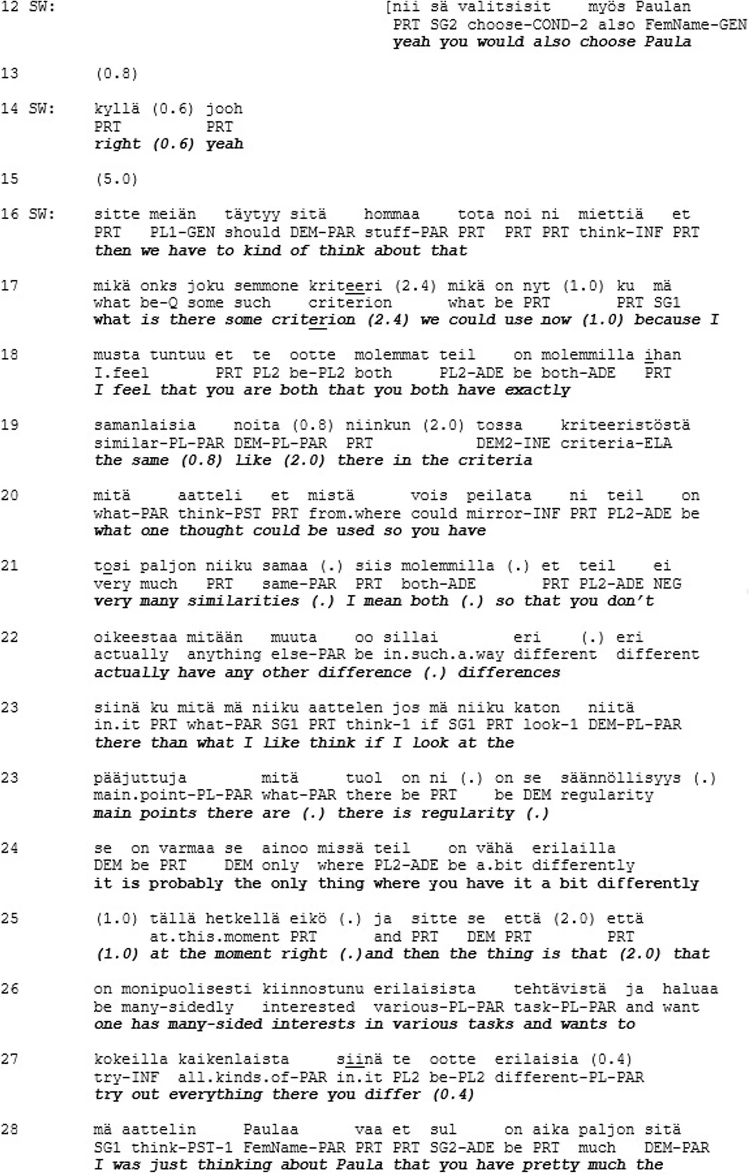 At the beginning of the extract the support worker (SW) initiates a procedure to get the Clubhouse members vote among themselves the one who they think should get the employment (l. 1–4). The voting procedure results in Paula getting most of the votes (l. 5–14). However, instead of declaring Paula the winner of the vote, a long silence follows (l. 15). Thereafter the support worker announces a next item in the agenda, which is to come up with the decisive criterion for making the decision (l. 16–17). In so doing, the support worker effectively undermines the relevance of the previous voting result. Instead, a much more unilateral way of making a decision is reflected in the support worker’s lengthy evaluative account of the qualities of the candidates (l. 16–29). In essence, the support worker introduces ‘regularity’ and ‘versatility’ as criteria with reference to which Paula and Julia are said to differ (l. 21–27) and Paula to fall short (l. 28–29). Thereafter, in an attempt to request for Paula’s confirmation for his assessment, the support worker uses a turn-final question particle (eikö ‘right’ l. 21). However, most likely in anticipation of an upcoming disagreement, the support worker softens the assessment, while Paula indeed produces a disagreement in overlap with the support worker. In displaying a need to defend herself against the criteria imposed by the support worker (l. 32–33) Paula orients to the possibility that she may still lose the selection, irrespective of her just previously having won the vote. Thereafter the support worker directs the selection process in a way that it really is Julia, and not Paula, who will be selected to get transitional employment.