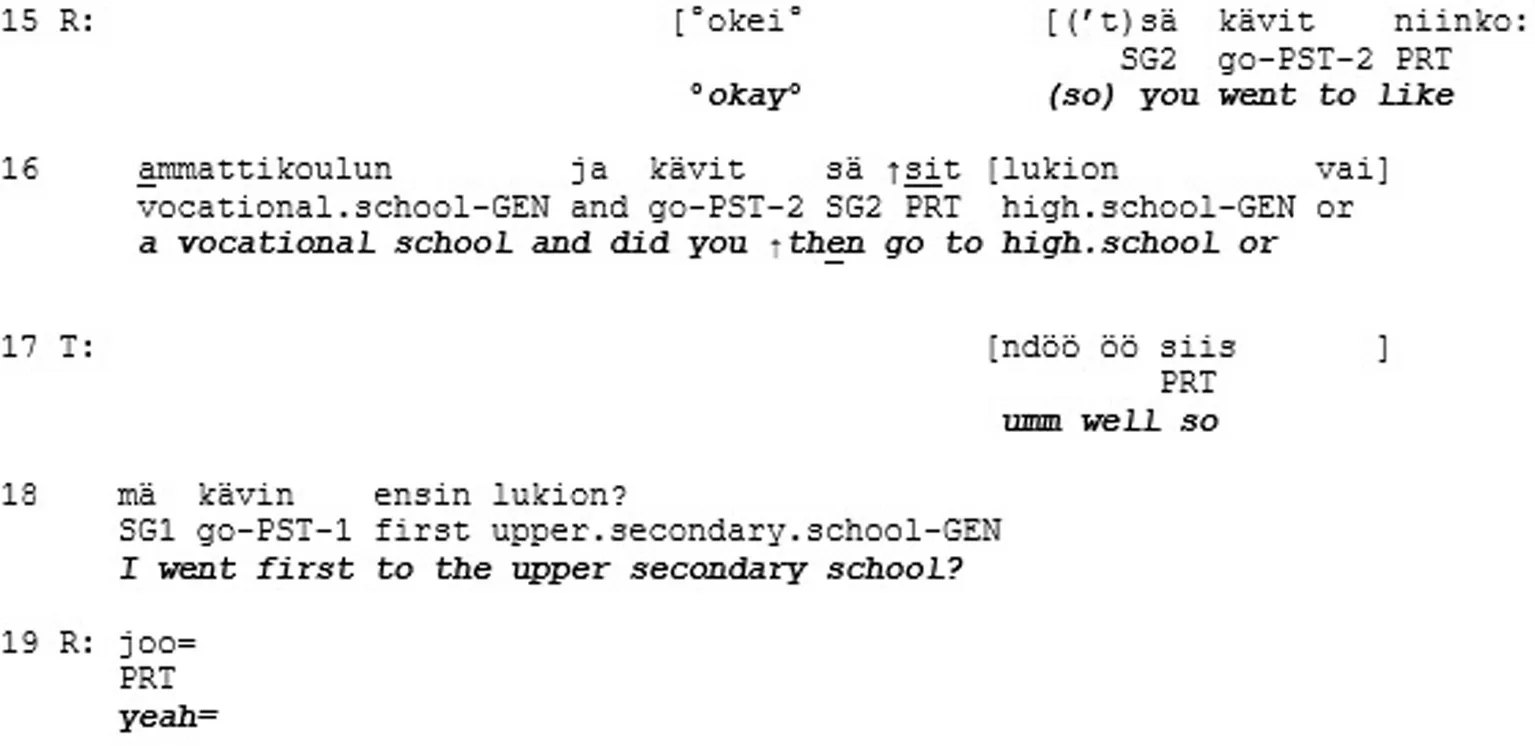The teller (T) first makes the positive affective stance of the telling (cf. Stivers, 2008) explicit by mentioning that this is a thing where he has succeeded (l. 1). He continues by declaring that he graduated on his first try (l. 1–2). This, however, only elicits a slow, upward nod from R, which leads T to continue “which is totally a miracle because school for me went pretty much off-handed” (l. 2–3). This elaboration elicits a minimal response “okay” from R with a slightly surprised prosody (l. 4). Then T continues by slightly changing the affective stance by making it humorous “and it is still kind of our standard joke” and imitates direct reported speech “it is a miracle that he graduated” (l. 5–6), which receives a small laugh-token from R (l. 7). The lukewarm display of affiliation by R is understandable, as self-deprecating stances can be difficult for recipients to endorse (Pomerantz, 1984). Then T returns to his original stance of success by emphasizing “and even like on the very first try” (l. 8), which does not elicit any reaction R. Then T continues “although I have to admit that it was close” (l. 9–10). This, again, only gets an acknowledgement “okay” from R (l. 11). Then, finally, after T has emphasized again how close his graduation was (l. 12, 14), R responds to the telling with a longer turn: “(so) you went to a vocational school and did you then go to upper secondary school or” (l. 15–16). This question clearly circumvents the stance of success that T has introduced in his telling (cf. Koskinen et al., 2021). After the question, the participants continue to talk about T’s school background and neither the feeling of success nor the event of graduating is returned to.