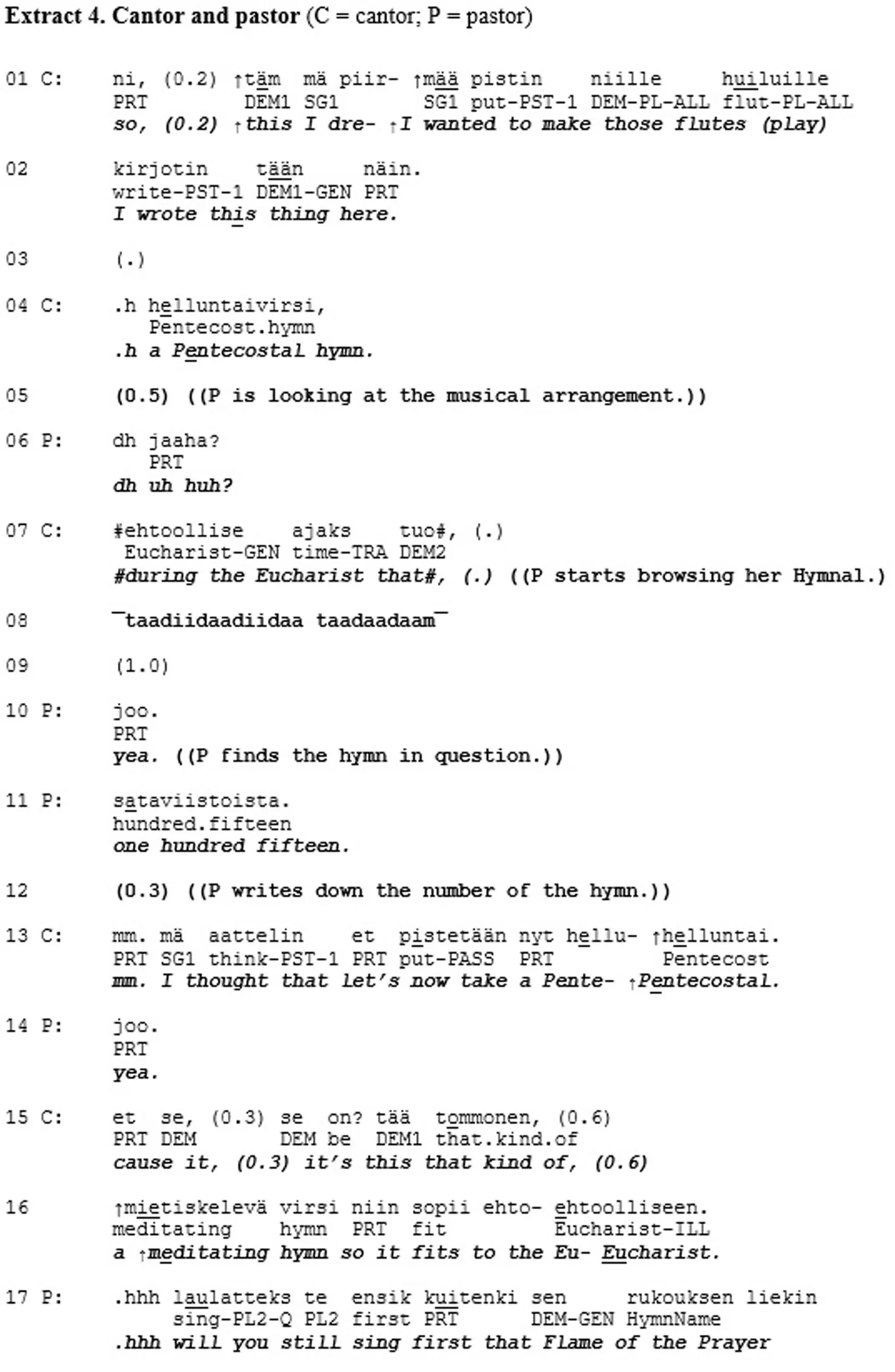 We will now move on to analyze a case in which two components of esteem—the one based on role-specific status and the one based on positive personalized qualities—both serve as possible bases of positive assessment. Extract 4 is drawn from the study by Stevanovic and Peräkylä (2014). Here, a pastor (P) and a cantor (C) discuss the Pentecost mass, and the cantor shows to the pastor a hymn arrangement that he has made for the event (l. 1–2).