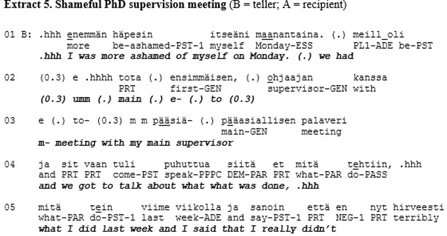 | Extract 5. Shameful PhD supervision meeting | X | X | — | — | Orientation to interpersonal affiliation |