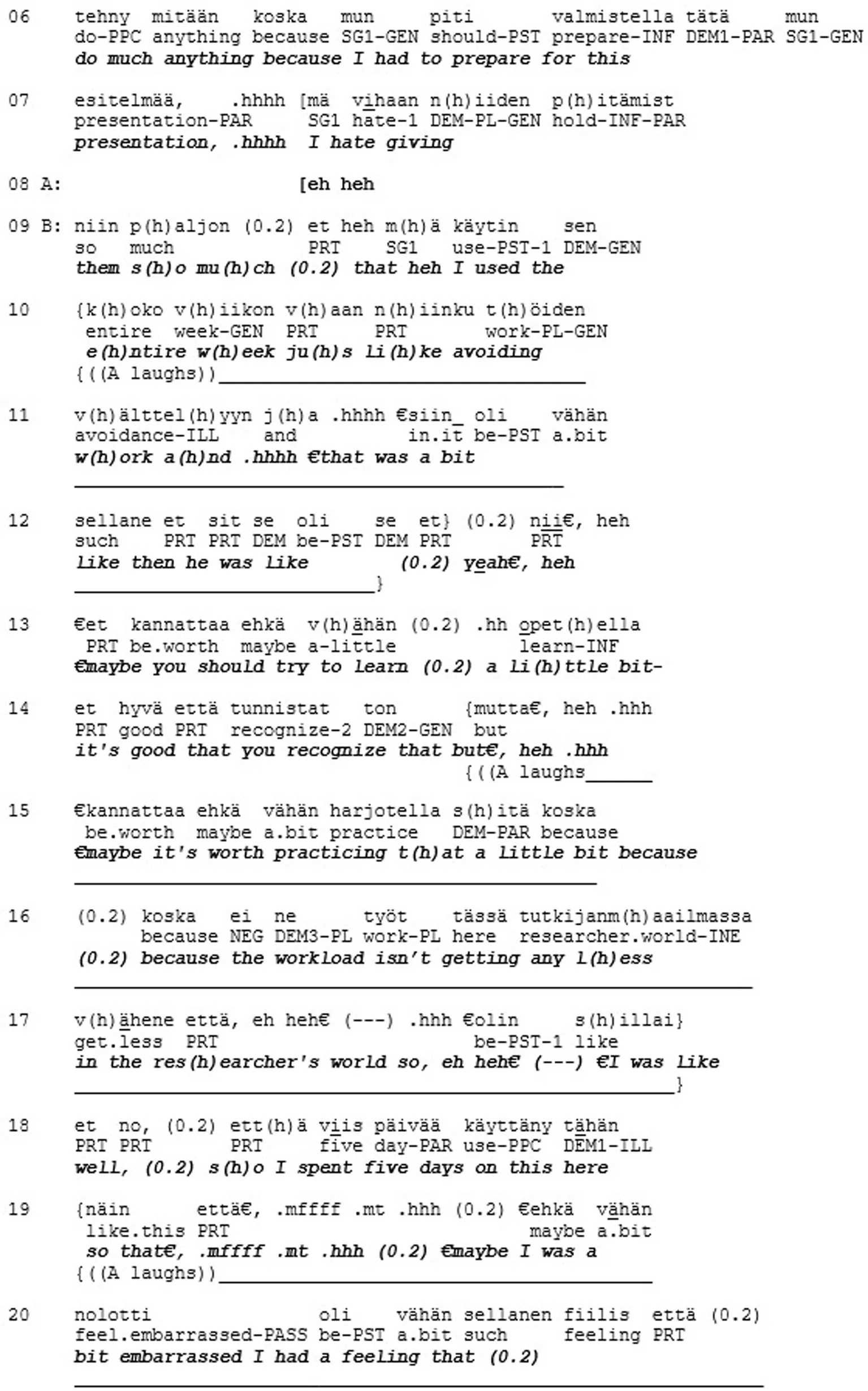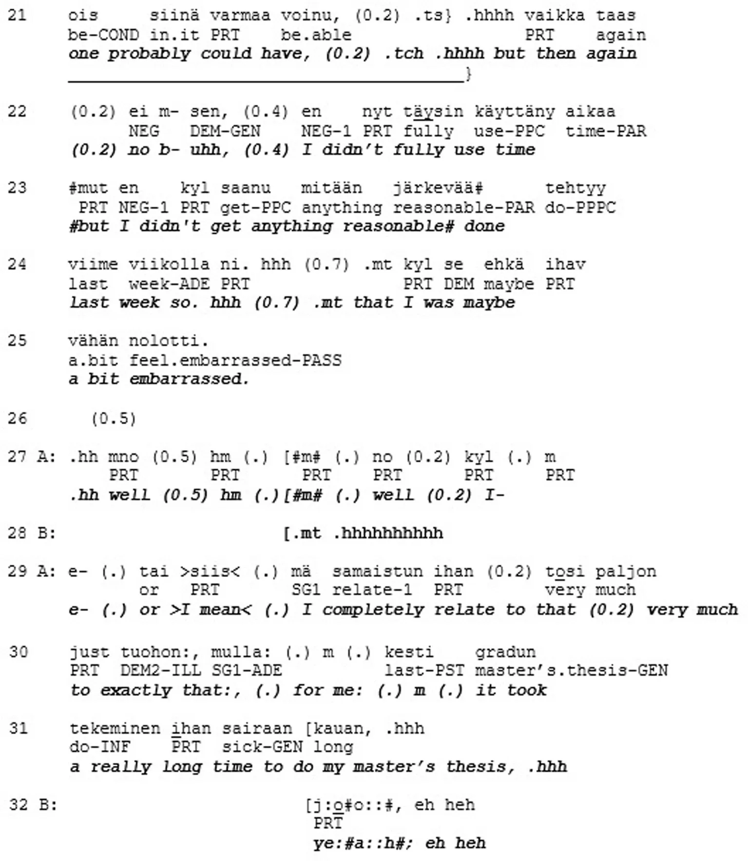 The teller (B) describes a meeting with her supervisor where she admitted not getting anything done in the previous week (l. 1–25). The story is produced with a humorous, laughing tone, and the recipient (A) produces affiliative feedback (i.e., smiling, laughter) throughout the whole telling (l. 8–21). After B is finished with her story, A displays affiliation with “I completely relate to that, very much to exactly that” (l. 29–30) and produces a short second story (Sacks, 1992) about her own masters thesis that took a long time to do, affiliating with A by conveying to her ‘I’m with you’ (see Jefferson, 2002).