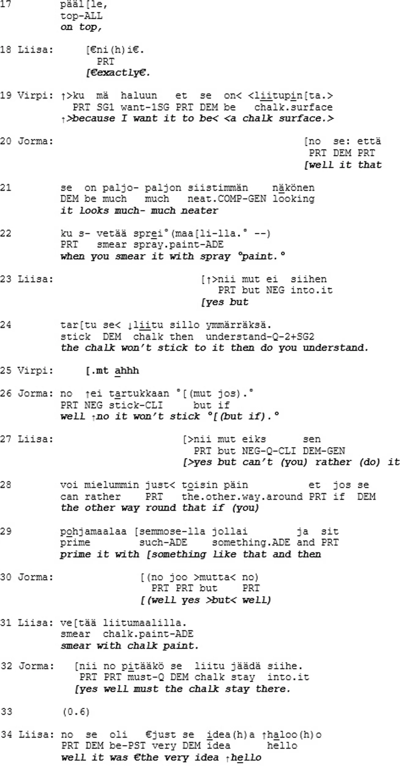 Virpi makes the announcement to the other family members that her idea is to paint the box with black chalk paint (l. 1–2). Jorma’s response is quiet and indeterminable (l. 3, 5), and Virpi continues by clarifying that they already have the paint available (l. 6) and explains how they could then write something on the box (l. 6–7). Jorma questions this plan and asks if spray paint would be better (l. 8–9). Virpi responds with a sing-song voice “no I want to have it with the chalk paint” (l. 11). To this Jorma suggests a compromise that they would use the chalk paint first and then spray paint over it. (l. 12–13). At this point the daughter Liisa joins the discussion to point out that this would not make any sense (l. 14), and Virpi seconds her by explicating that then the chalk surface would not be there (l. 15–17). Once more Jorma suggests that the spray paint would look better (l. 20–22), after which Liisa repeats their reasoning that then the chalk would not stick to the paint and adds “do you understand” (l. 24), emphasizing the miscommunication about the matter. They continue the discussion.