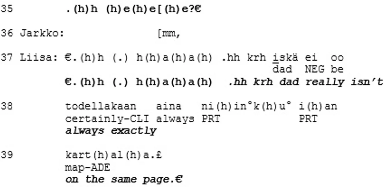 until finally Jorma asks “yes well must the chalk stay there?” (l. 32). This receives open mocking “hello” and laughter from Liisa while Virpi rolls her eyes and head (l. 34–37). Liisa concludes with a general assessment concerning Jorma: “dad really is not always exactly on the same page” (l. 37–39), to which Jorma responds quietly “what” (l. 40).