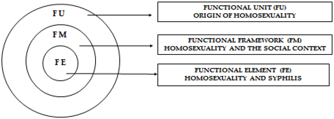 The Multiple Event Detection and Classification (MEDC) methodology is based on structures that serve as support for the process of ordering and analyzing the data. In this research, its application is important due to the social, cultural, and care study in which we are involved. Therefore, the structures applied to it are the following: (1) functional unit (F.U), where the origin of sexual and gender minorities in the various social systems that determine sexual and gender diversity, other than the binary dimension, is addressed; (2) functional framework (F.M), related to sexual and gender minorities within the social context; and (3) functional element (F.E), which in this case reflects the relationship between sexual and gender minorities and syphilis. These structures utilize a suitable tool for the organization and analysis of the data since the aim is to obtain a vision of the historical phenomena from the perspective of cultural history (Siles González, 2004). Within this study, three thematic blocks were developed centered on the MEDC; each one of them encompassed the structures that make up this historical and cultural model (Siles González and Solano Ruiz, 2016) (Figure 1).