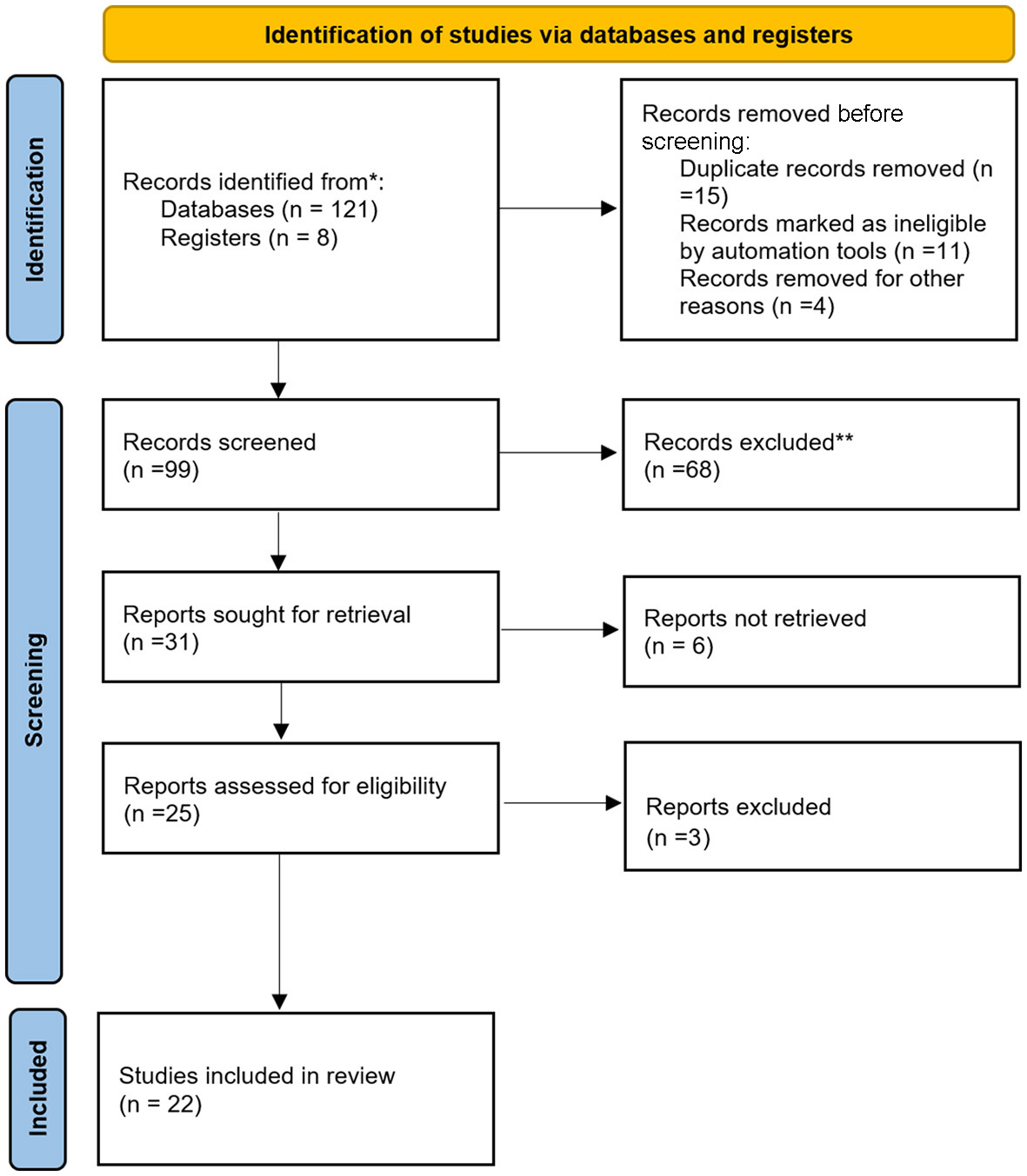 As can be observed in the PRISMA strategy, 129 publications were identified in the database. However, once the documents were filtered, 99 studies were selected, of which 31 were adjusted to the search strategy, although, to undertake this study, only 22 were useful. It should be noted that most of the documents were published in the 21st century, probably due to the current interest in understanding people with sexual and gender diversities beyond the binary dimension. The findings from the 22 selected studies were categorized into three common thematic blocks for further analysis to provide clarity and consistency in the topic of study. The main thematic lines focused on three common thematic lines: (1) understanding the views and perspectives of the origin of sexual and gender minorities, which was the focus of 10 studies; (2) exploring sexual and gender minorities in the social context, which was the focus in five studies; and (3) determining sexual and gender minorities and syphilis, which was discussed in seven studies.