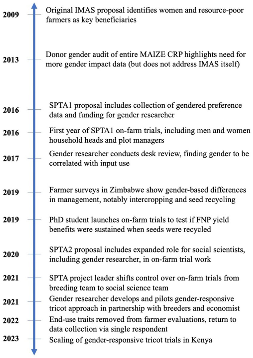 Timeline of gender integration into Seed Production Technology for Africa (SPTA) activities.