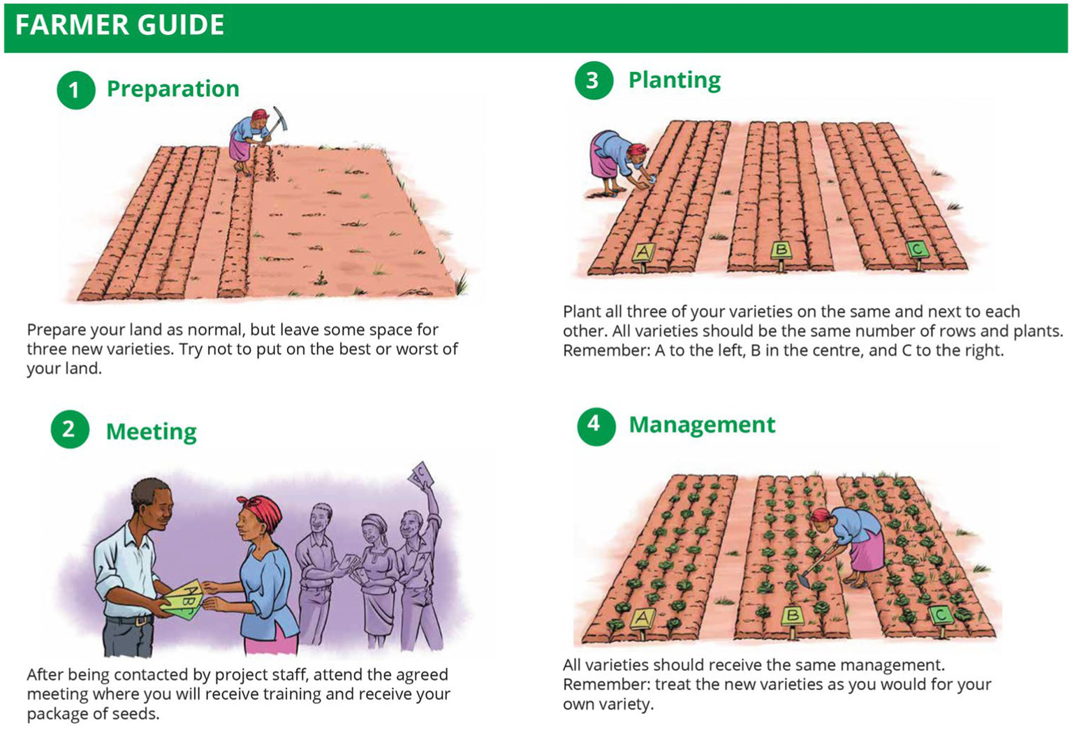Participants in on-farm tricot trials received visual guidance emphasizing that they should practice their preferred management within the trial setup. Image provided by the 1000FARMS and Scaling Tricot projects: https://climmob.net/blog/wiki/graphic-resources/.