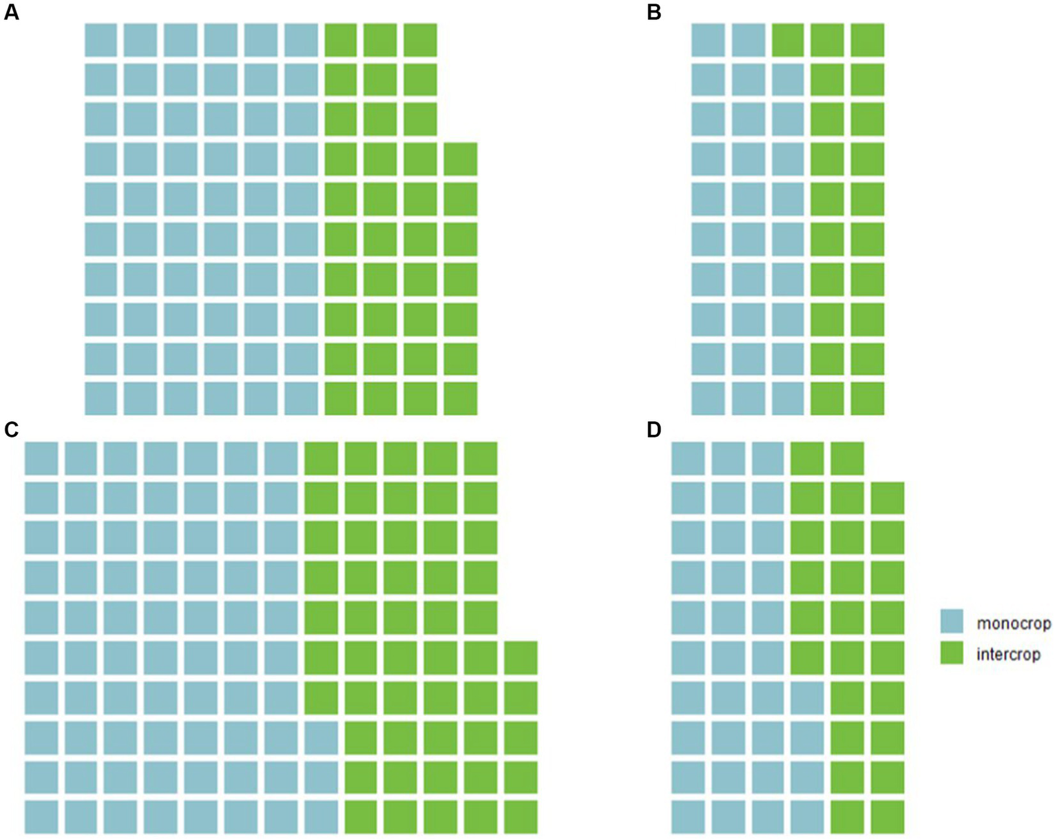 The number of (A) women farmers in Embu, (B) men in Embu, (C) women in Kiriyanga, and (D) men in Kiriyanga using monocropping and intercropping illustrate the diversity of farmer management in 2022 tricot trials in Kenya.