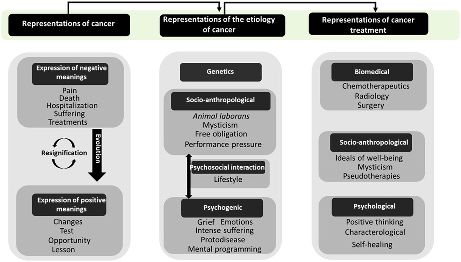 SRs of cancer at the time of diagnosis evoke negative connotations. However, cancer is redefined as a positive event as the clinical course of the disease progresses, and patients interact with health professionals and respond to treatment. The resignification of the disease depends on the etiological models of the patients, which include genetic, socio-anthropological, psychosocial, and psychogenic factors. In line with the SRs of etiology, patients seek out treatments complementary to the biomedical ones that can be socio-anthropological and psychogenic.