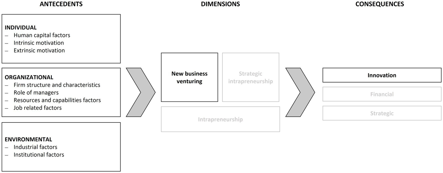 To close the research gap regarding what is CSE and which antecedents must be given in advance we adapted the conceptual model for corporate entrepreneurship from Urbano et al. (2022) (see Figure 1). The rationale behind this is, as far as we know, it is one of the latest SLR results focusing on all three levels of antecedents, individual, organizational and environmental, with a ground basis of literature. With our understanding of entrepreneurship aligning with the findings from Schumpeter, the adaption of the model for our investigation is necessary, as we understand entrepreneurship is solely possible with new business venturing plus, in this research, we focus on the niche of corporate start-ups. For the sake of completeness, Urbano et al. also mention the dimensions of strategic intrapreneurship (no new business addition but rather restructuring and organizational rejuvenation) and intrapreneurship, in addition to the dimension of new business venturing. Both dimensions are out of focus for our work and, therefore, removed from the original model, as shown below. Lastly, the consequences of new business venturing shall be innovation and not, as Urbano et al. put it, strategic and financial. Nevertheless, the adapted model allows to provide a systematic content analysis and organizing framework for the SLR we undertook.