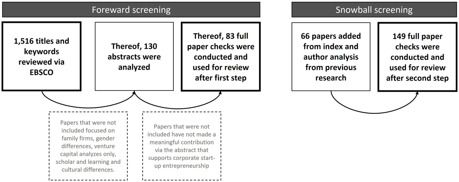 The first analysis (forward screening) is based on EBSCO database and took place between 2021 and 2023. EBSCO was chosen due to its coverage of articles that focus on management and new venture topics. Supplementary Tables S1a, S1b, show which keywords were used to start the elaboration. We decided on the following keyword combinations as there are the most commonly used terms in the literature to describe entrepreneurship in corporate start-ups: “corporate start-up,” “corporate start-ups and entrepreneurial leadership,” “corporate start-ups and intrapreneurship,” “corporate split-off” and “corporate split-off leadership.” For each keyword combination, it can be deduced how many articles were searched. A combination of keywords had to be chosen, as the individual terms would have yielded too many results in terms of quantity and too many deviating results in terms of content. We used Boolean logic (using “AND” or “OR”) to connect the keywords. The combinations consisted of one term from the organizational setting and one term from the area of entrepreneurship in order to link the two research areas. We searched for these words in the title, abstract, keywords, and in the body text and did not limit our search to any specific period of time.