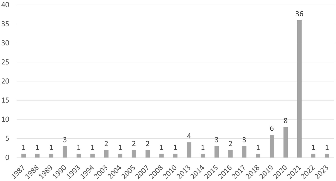 To objectivize the descriptive analysis, we conducted this analysis utilizing a standardized spreadsheet, which was developed a priori. We gathered information regarding the author(s), title, year of publication, journal, findings, critique, and respective keyword combinations. The oldest paper dates back to 1987, and the most recent was published in 2023 (the search ended in January 2023), as shown in Figure 3. Over the years, the number of articles increased significantly, from mostly 1 to 2 articles per year in the beginning to a much larger number only recently. The articles and authors were predominantly from the fields of economics and human sciences.