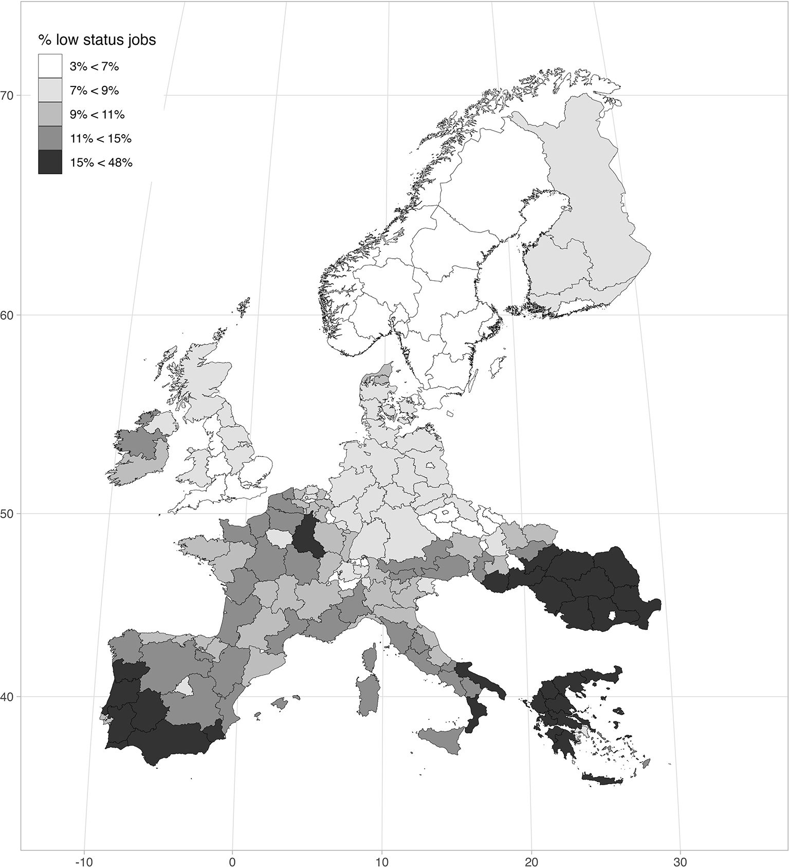 Figure 1 provides visual evidence of how large within-country differences in terms of labor market quality are. The map reports the quintiles in the distribution of the share of low-status jobs at regional level, highlighting a heterogeneous distribution among and within countries: on the one hand, bad jobs are more widespread in Southern European countries and in Romania, while the lowest levels are found in Central-Northern Europe; on the other hand, important internal differences are found in France, Italy, Spain and Hungary. As the figure shows, when differences between regions are considered, country differences appear more blurred, even though most institutional characteristics do not vary within the same country. This confirms the importance of focusing on the regional level when the task is to assess the moderating role of labor markets on our outcomes of interest.