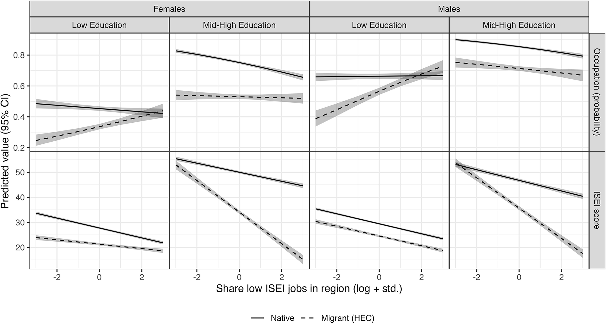 We offer a further illustration of the patterns observed by means of prediction plots, to address the troublesome interpretability of interaction effects, especially in the case of non-linear models (as in the model for employment) (Mood, 2010). Figure 2 shows the predicted values of the dependent variables (probability of being employed for the first model, ISEI score for the second) for the different subgroups analyzed.