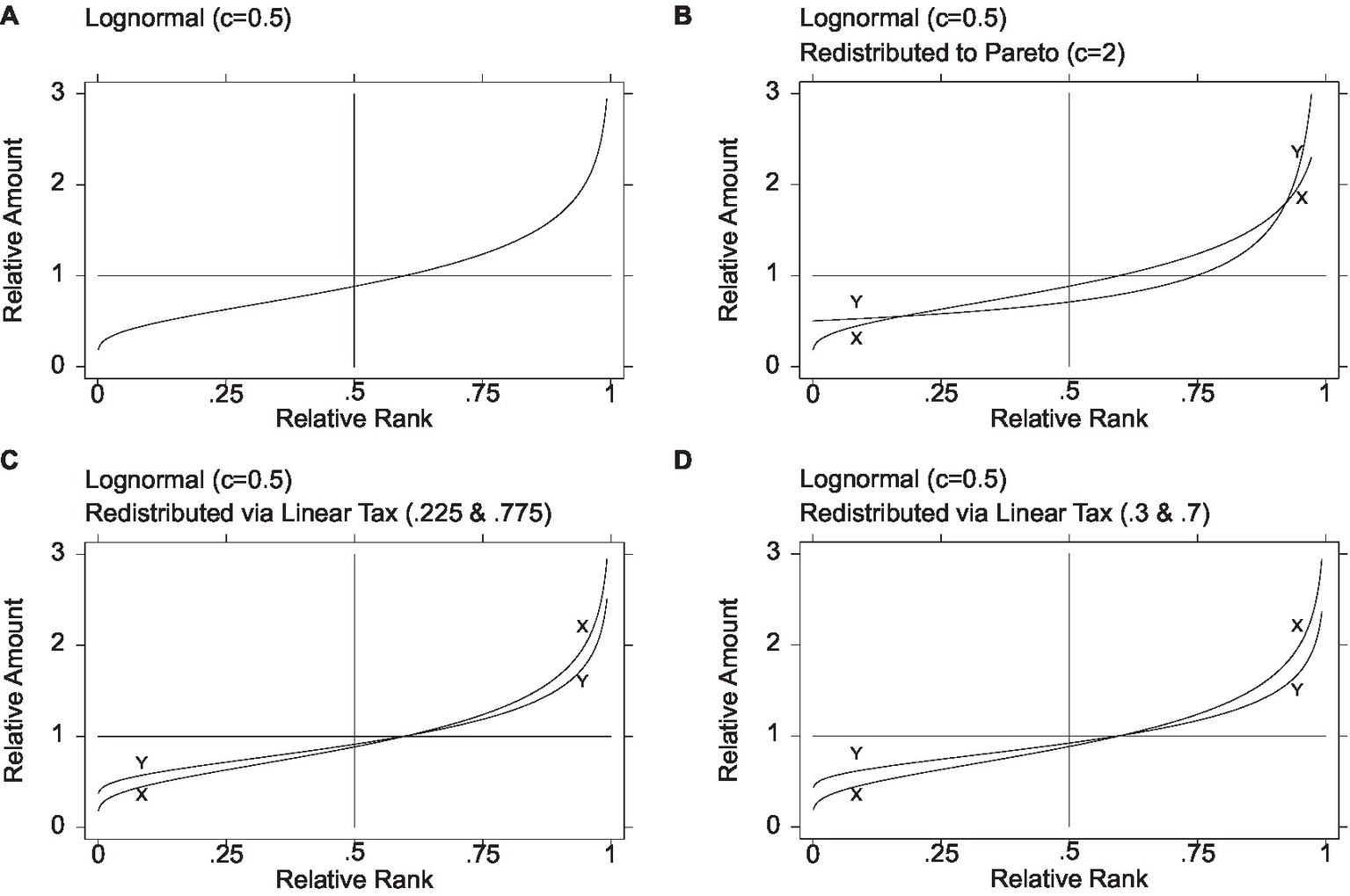 Figure 2C depicts the graphs of relative amount on relative rank for the pretax distribution (lognormal of c = 0.5), denoted X, and the posttax distribution obtained from the 0.225 to 0.775 tax system, denoted Y. As shown, the two graphs intersect only once, at the mean of one and the relative rank of approximately 0.599. Thus, the leftmost 60% have gained from the redistribution, and the rightmost 40% have lost. The lowest income has increased from close to zero (in a population of a 1,000, approximately 18.8% of the mean) to 37.1% of the mean. The highest income has declined from 4.14% of the mean (again, in a population of a thousand) to 3.43% of the mean. Of course, in a population of millions, the figures at the extremes would differ. The three overall inequality measures—Gini, MLD, and ATK—register 0.213, 0.0713, and 0.0688, respectively, indicating a nontrivial decline in inequality. The share held by the top 1% is 2.76%. Finally, to gauge inequality among the poor, following Parolin et al. (2023), we obtain the 5th and 15th percentiles (0.525 and 0.632), yielding a P15/P5 ratio of 1.203 and suggesting less inequality among the poor than in the lognormal, where it is 1.356 (but more than in the Pareto, where it is 1.057, visible in the curve’s flatness).17