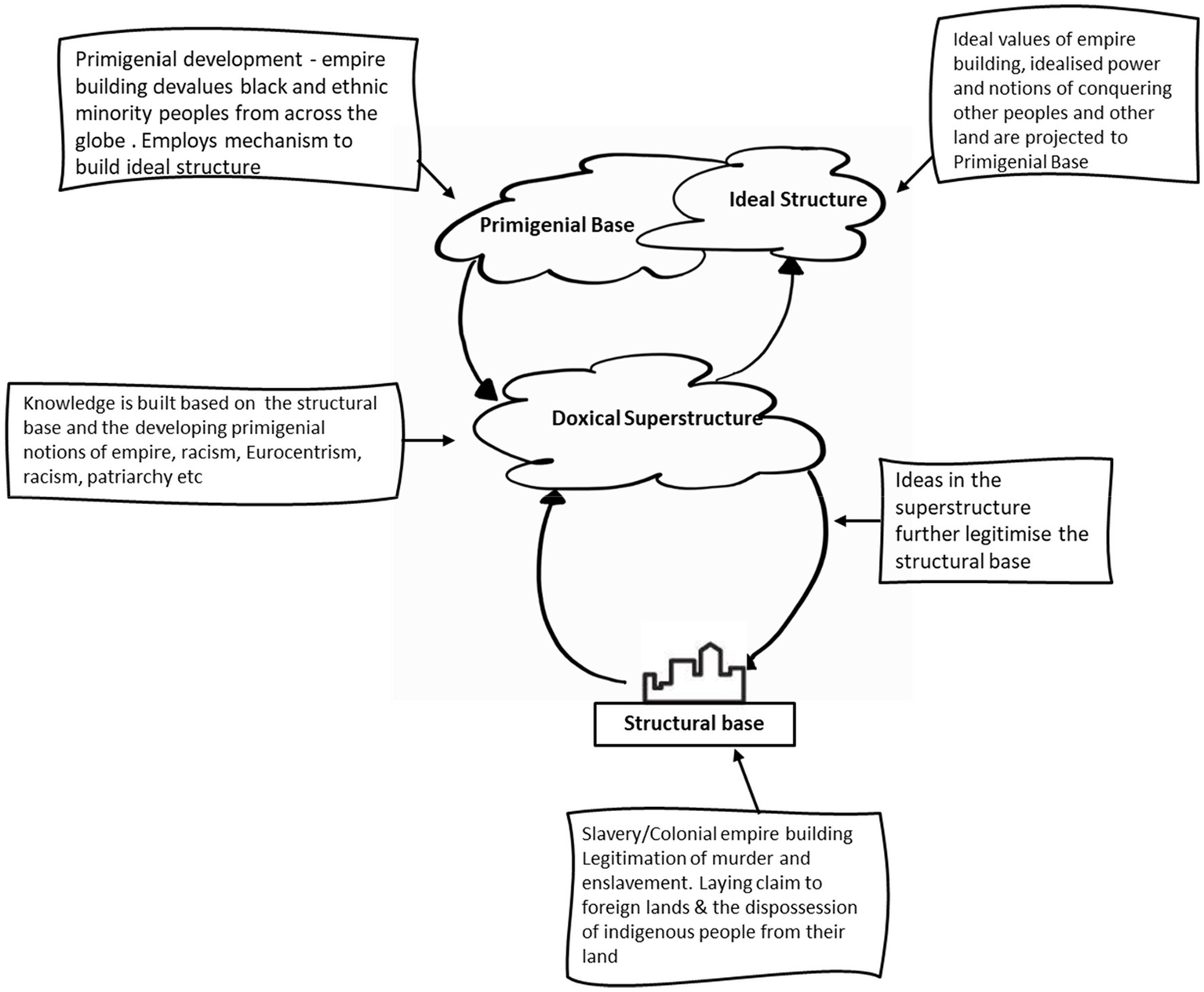 Compartmentalisation within the structural base and superstructure, importantly, facilitates the naming of discrete components and, successively, the interrogation of the global order and its underpinning mechanisms which are “androcentric, hetero-patriarchal, racist, sexist, Euro-North American-centric…colonial, and capitalist hierarchies and heterarchies” (Ndlovu-Gatsheni and Ndlovu, 2021, p. 90). Nescolarde-Selva and Usó-Doménech (2014, p. 63) assert that ‘not to distinguish between complex ideologies, and ordinary ideas, beliefs, myths, prejudices and so forth, is to lose a whole level of analysis.” One may argue that, in terms of stratifying power, it is not just a matter of distinguishing between “complex ideologies and ordinary beliefs” (Nescolarde-Selva and UsóDoménech, 2014, p. 63). Rather, it is a matter of also bringing both ideology and prejudice to understand how one is associated with the other and to understand how ideology can act as the driving force behind prejudice. In this way, one can engage with examining the embedded power at each level. If power is to be understood as “the production of intended effects,” (Russell, 1938, p. 18) or one’s “ability to produce intended effects upon the world around them” (Beetham, 1991,p. 43), then distinguishing between low-level ideas that are not immaterial but yield less power and, for example, state-sanctioned ideologies becomes important. Doing so facilitates the examination of every power (Bourdieu and Passeron, 1990), including the power that conceived society epistemically, the power that articulated it ideologically, the power that ordered it practically, and the power that upholds the status quo. It is not without merit to argue that scholars such as Robinson (2000) in their articulation of racialised capitalism do exactly that. Robisnson’s (2000) Black Marxism centralises the racial struggle against the backdrop of the formation of the present modern world encapsulating the conceiving epistemology and guiding ideology and operational practicalities, and it is in this stratification that one can examine every power. That is “every power which manages to impose meanings and to impose them as legitimate by concealing the power relations which are the basis of its force, [adding] its own specifically symbolic force to those power relations” (Bourdieu and Passeron’s, 1990, p. 4). It is in this stratification and process of highlighting the loci where power resides that one can engage critically with the process of denaturalising the doxic and understanding the processes that have legitimised and continue to legitimise power. Whilst this creates room for a more nuanced conceptualisation of power, it is also a more complex conceptualisation of power. On one level, it considers how the superstructure, of which education (read university) is a part of, exercises power in its legitimisation of the structural base (read coloniality) (See Figure 3).