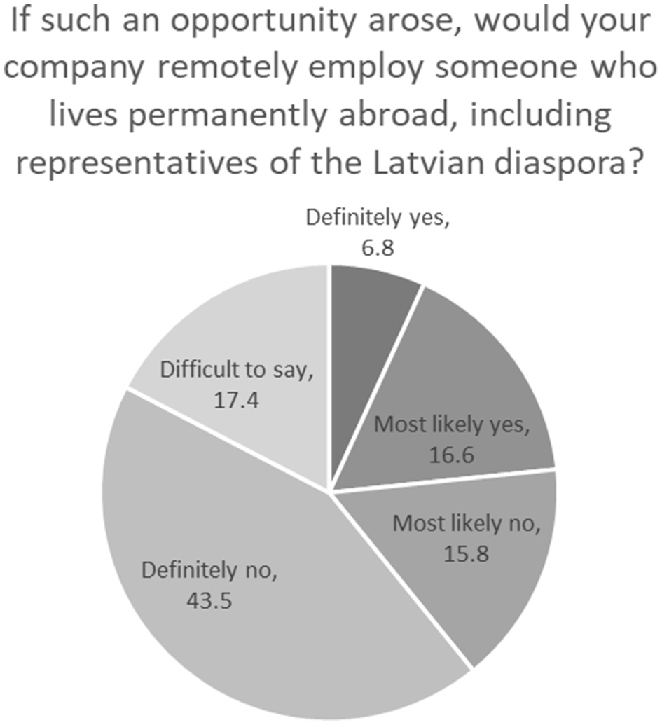 Our focus in this paper is on attracting diaspora professionals as remote workers to companies in Latvia (i.e., benefiting from their knowledge and skills), even though, as mentioned before, another option—attracting return migrants who keep a job abroad could be an even more promising opportunity for countries like Latvia to benefit from the rise in remote work. For the sake of simplicity, it will be addressed in future research papers.