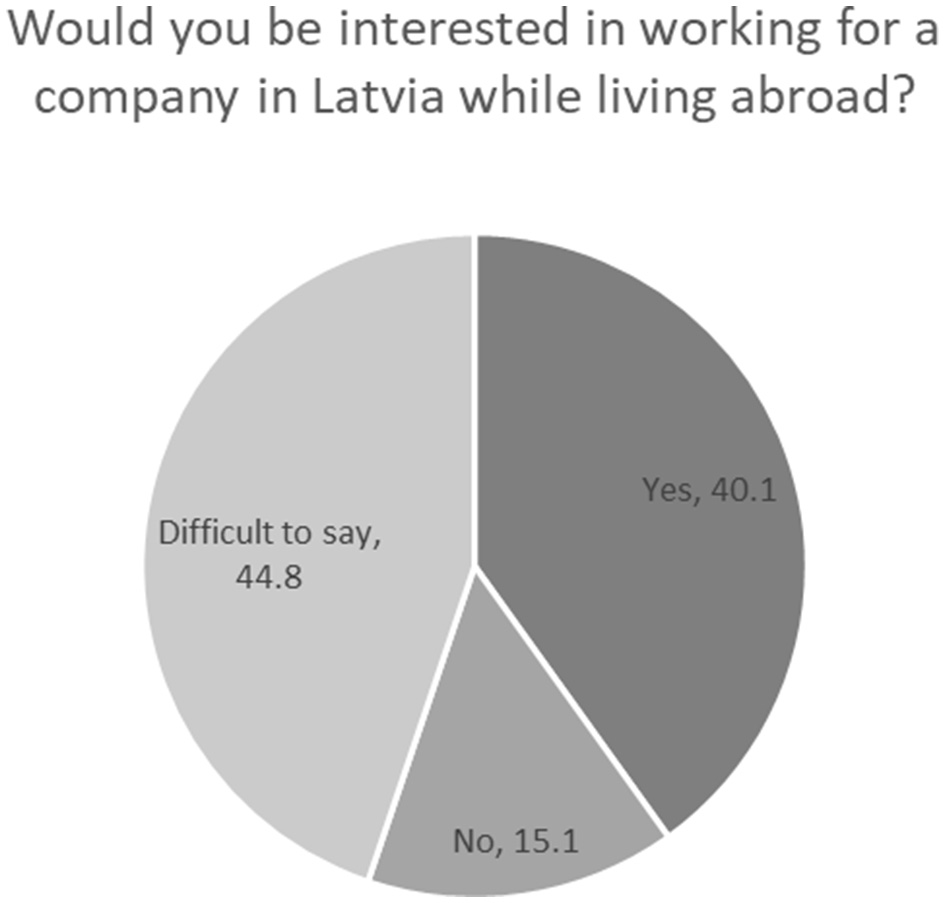 To estimate the potential of cross-border remote work, we asked our respondents who currently work remotely in the same country they live in, whether they would consider cross-border employment. The answers show that of those who currently live and work remotely abroad, 40.1% would be ready to work remotely for a company or organization in Latvia (while living abroad), while many found this question difficult to answer, as it depends on various circumstances and conditions (Figure 3). The number of remote workers outright rejecting the idea of cross-border work is relatively small.