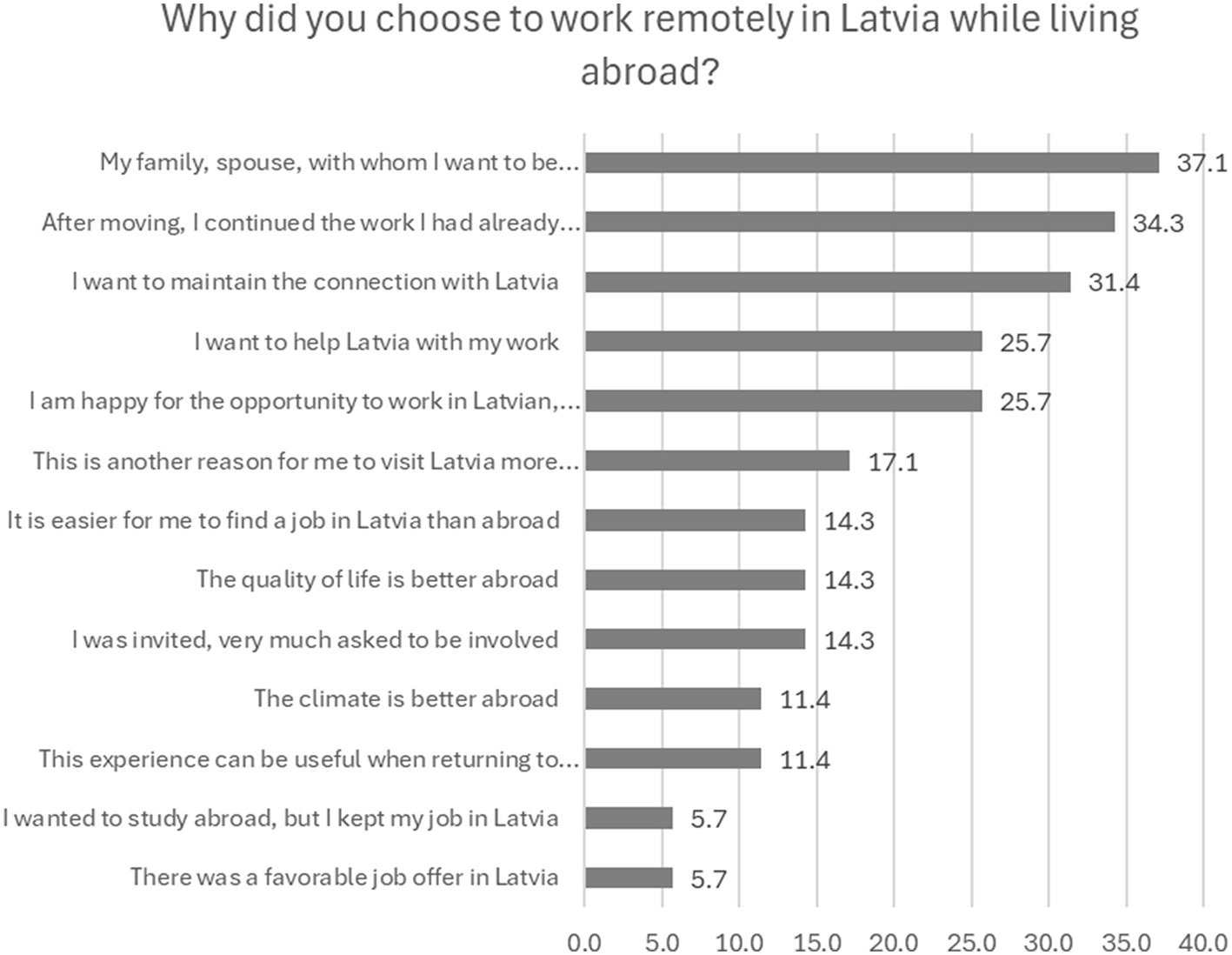 17.1% appreciate that work in Latvia serves as an additional reason for them to visit Latvia more often. A fourth of the respondents (25.7%) are happy about the opportunity to work in Latvian, with Latvian colleagues, while 11.4% indicate that this work experience can be useful when making a decision about a possible return to Latvia. However, other facts pointed out by some respondents are also quite important for choosing to work in Latvia while residing abroad—the quality of life abroad is higher (14.3%) and also the climate is better (11.4%). Similarly, 5.7% of respondents went to study abroad, but did not want to stop working in Latvia, so they continue to work remotely.