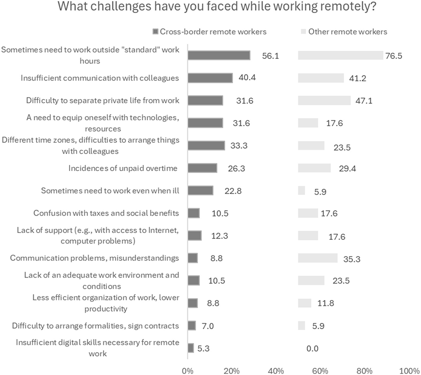 Next, we turn to the analysis of difficulties related to cross-border remote work. Just as for other remote workers, some of the biggest problems for these workers is that they sometimes have to work outside “standard” working hours (56.1%) and that they have difficulties in separating private life from work (31.6%). Cross-border remote workers also complain about insufficient communication with colleagues (40.4%) (Figure 5). The sense of great isolation both in relation to the company they work in and in relation to their work colleagues also transpires in in-depth interviews. Nevertheless, the interviewees emphasize that this is not an unsolvable problem, and everything depends on the employer's ability to improve the communication flow. Interestingly, in cross-border work situation communication problems and misunderstandings seem to be much less frequent (Figure 5)—probably because the colleagues are often culturally closer (in case remote work is in a company in their country of origin) or much of the communication is in a written form and easy to verify.