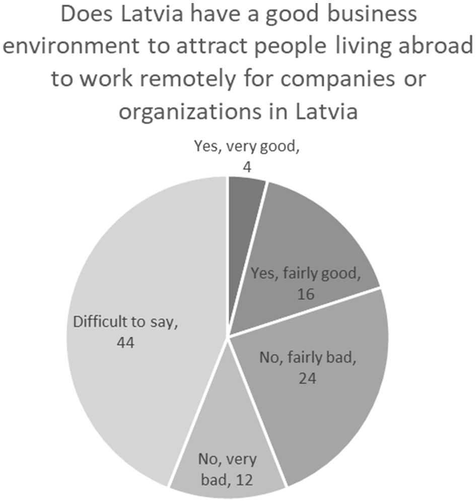 As mentioned before, Latvia and other countries in Central and Eastern Europe have significant advantages that may allow them to become not only a regional, but also global leaders in remote work: a fast Internet connection; good transport connections with other European and Commonwealth of Independent States (CIS) countries; a wide range of digital services; relatively fast adoption of digital technologies in the private sector; and a number of other factors. Those working remotely are satisfied with their job and most would like to continue working remotely, thus, cross-border employment provides an opportunity for countries suffering from emigration to return their lost human capital in the form of “digital migration.” The answers of our respondents, however, reveal a belief that Latvia could do better in attracting cross-border workers: just 20% rate Latvia's business environment as good for attracting people living abroad to work remotely for companies or organizations in Latvia. The study clearly highlights several challenges that hinder these benefits from transforming into a permanent flow of “digital return migration.”